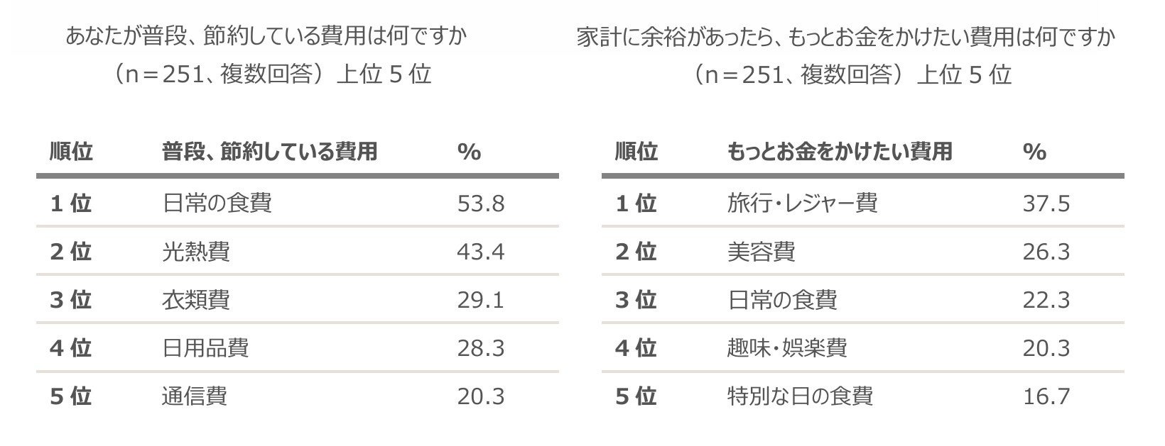 経営者の妻251名に、普段、節約している費用は何か聞いたところ、1位「日常の食費」(53.8%)、2位「光熱費」(43.4%)、3位「衣類費」(29.1%)という結果でした。また、家計に余裕があったら、もっとお金をかけたい費用は何か聞いたところ、1位「旅行・レジャー費」(37.5%)、2位「美容費」(26.3%)、3位「日常の食費」(22.3%)という結果でした。