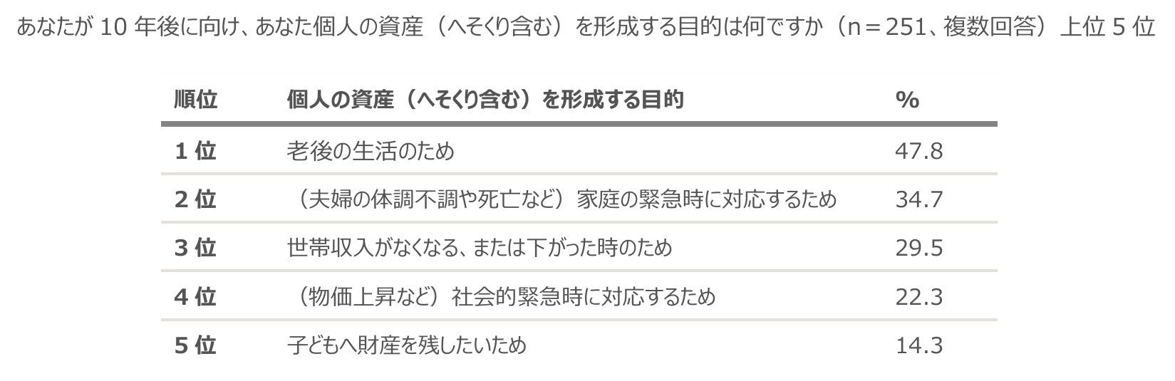 経営者の妻251名に、10年後に向け、個人の資産(へそくり含む)を形成する目的は何か聞いたところ、1位「老後の生活のため」(47.8%)、2位「(夫婦の体調不調や死亡など)家庭の緊急時に対応するため」(34.7%)、3位「世帯収入がなくなる、または下がった時のため」(29.5%)の順で、老後や緊急時に備えるためという意見が上位でした。