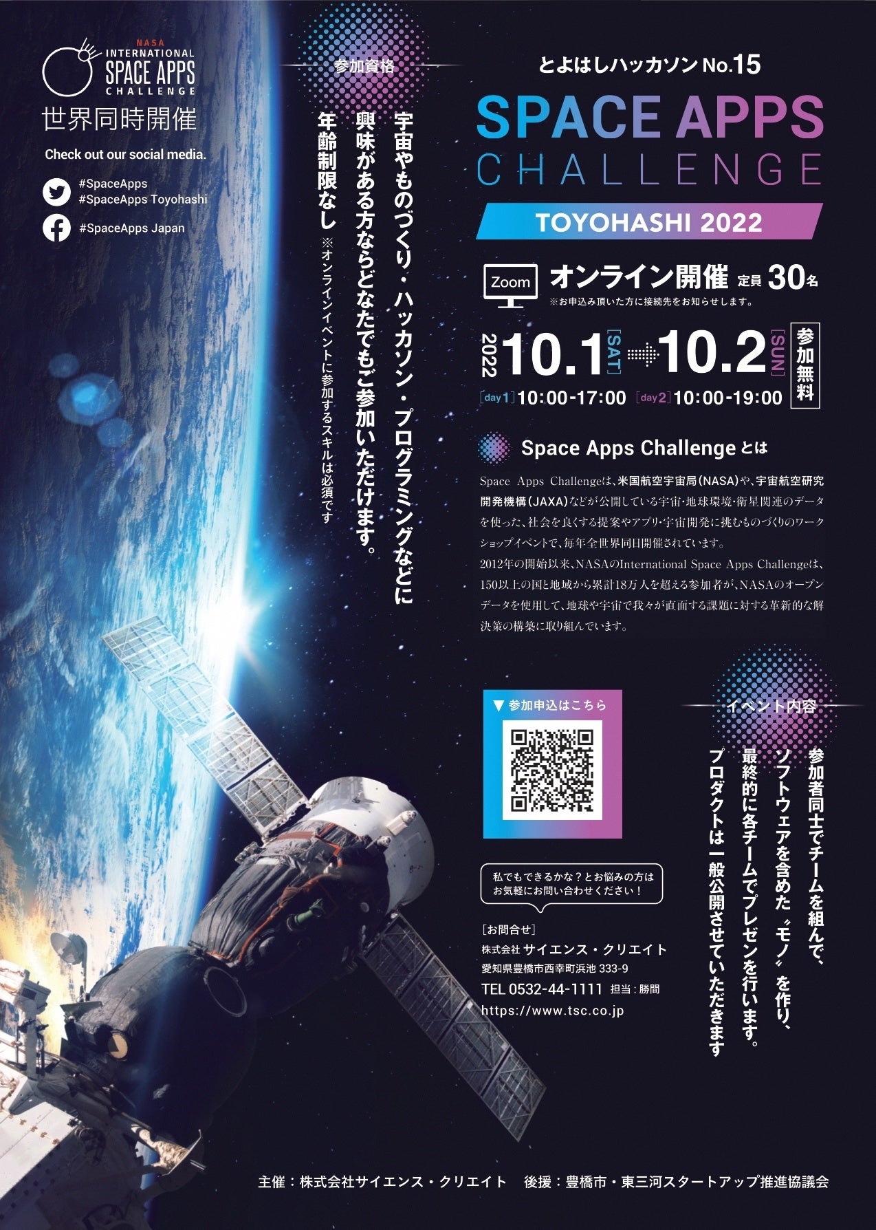 豊橋市は、「NASA Space Apps Challenge Toyohashi」として、第3セクターの株式会社サイエンス・クリエイトが主催します。