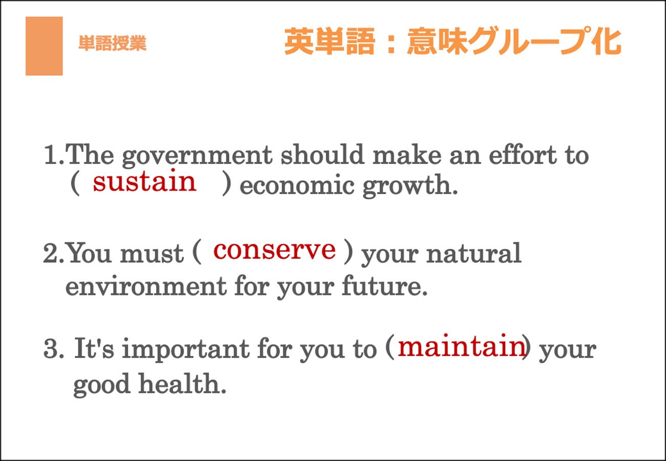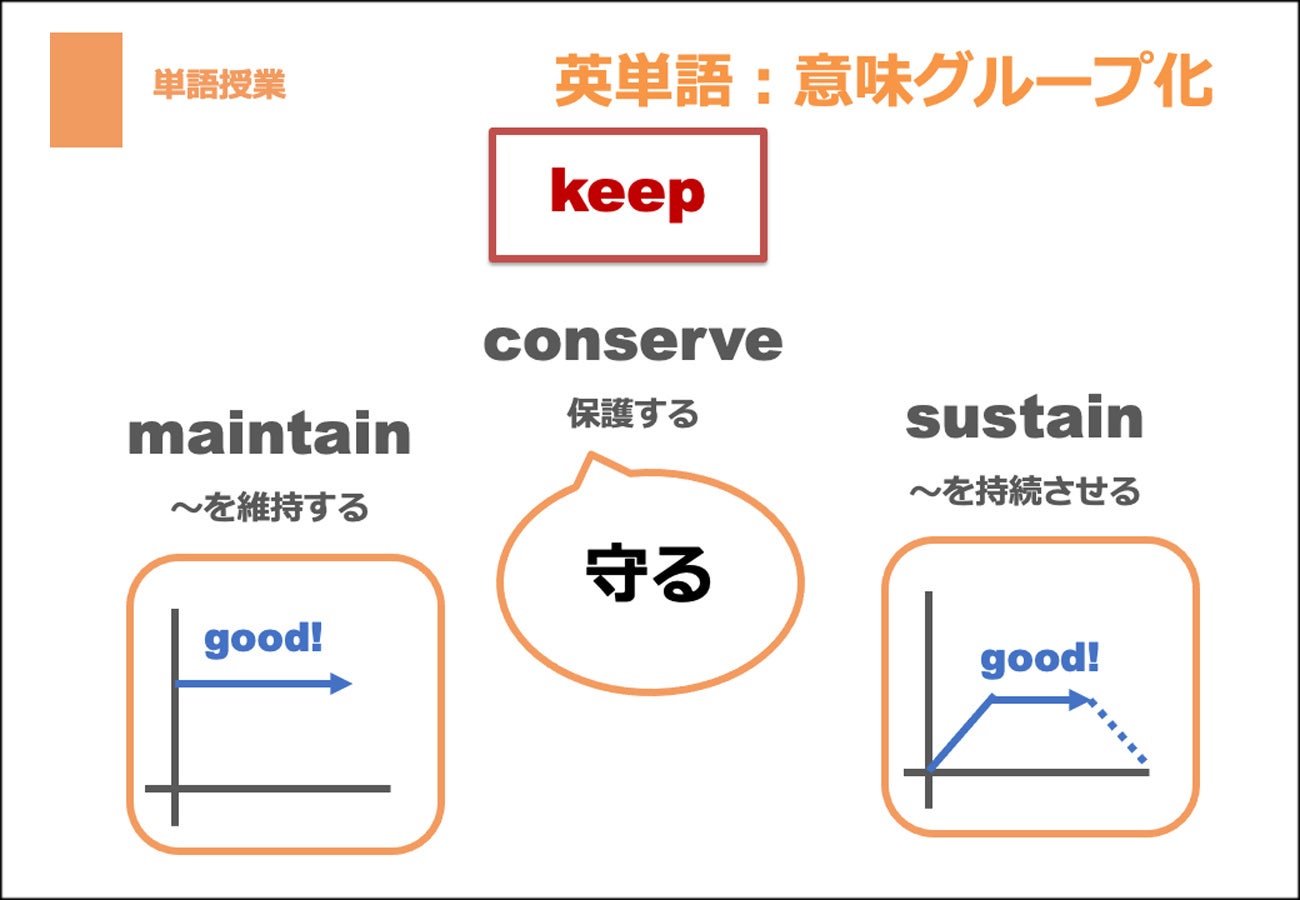 参加者たちが次に学んだのは英単語の意味グループ化。簡単な単語をキーワードとし、そのグループに属する複数の単語をキーワードが示すイメージでひとまとめに覚えるという勉強法です。例えば、「保つ・維持する」という意味を持つ「keep」という英単語で以下のようなグループを作成することができます。