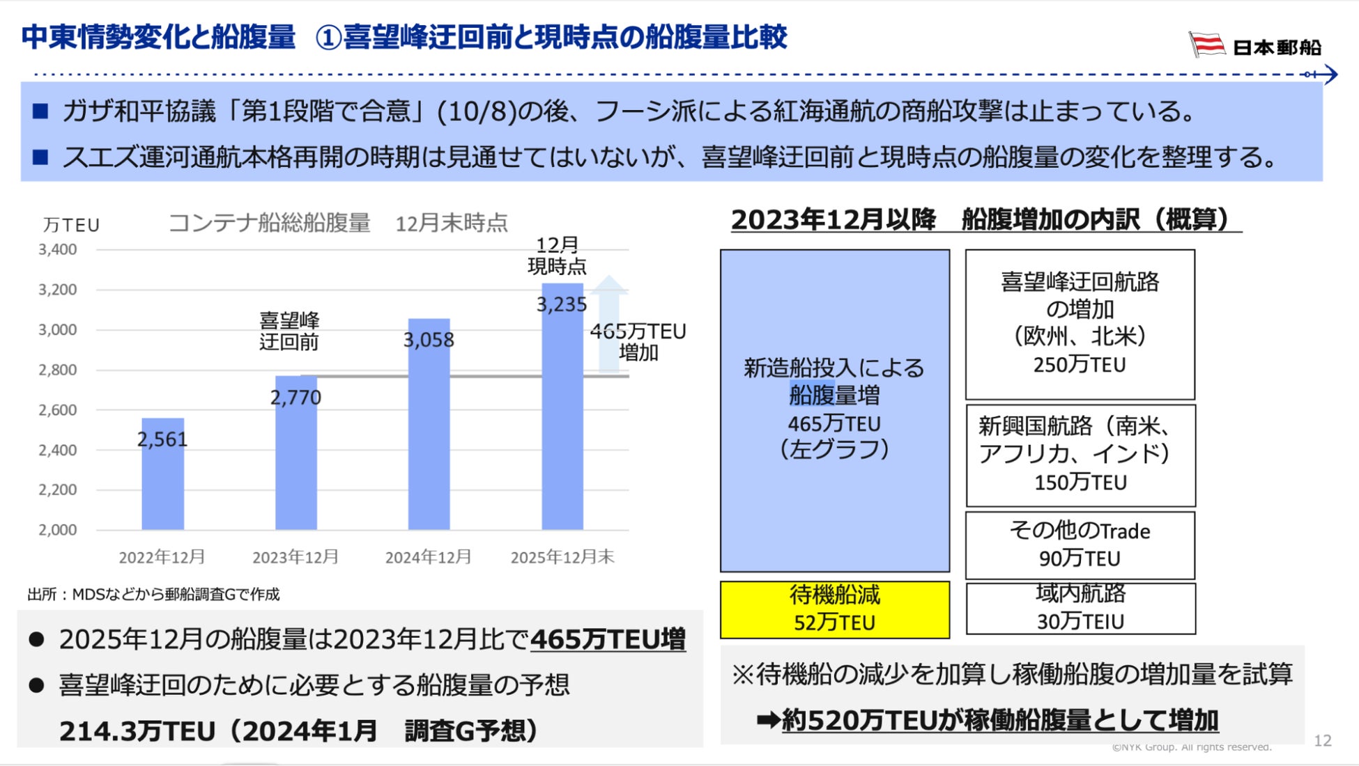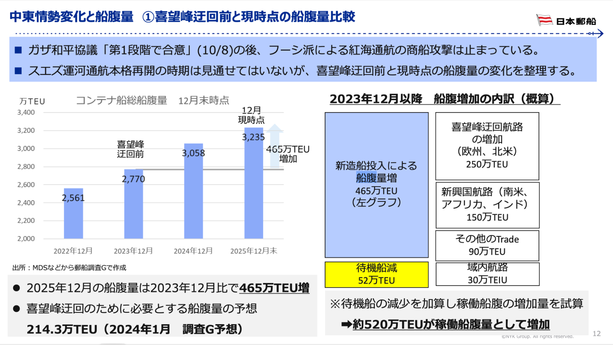 中東情勢の影響で喜望峰の迂回運航は今なお続いています。迂回に必要な船腹は2024年末までには竣工しています。今年竣工した新造船は、荷動きのさらなる拡大に対応するものとなりました。