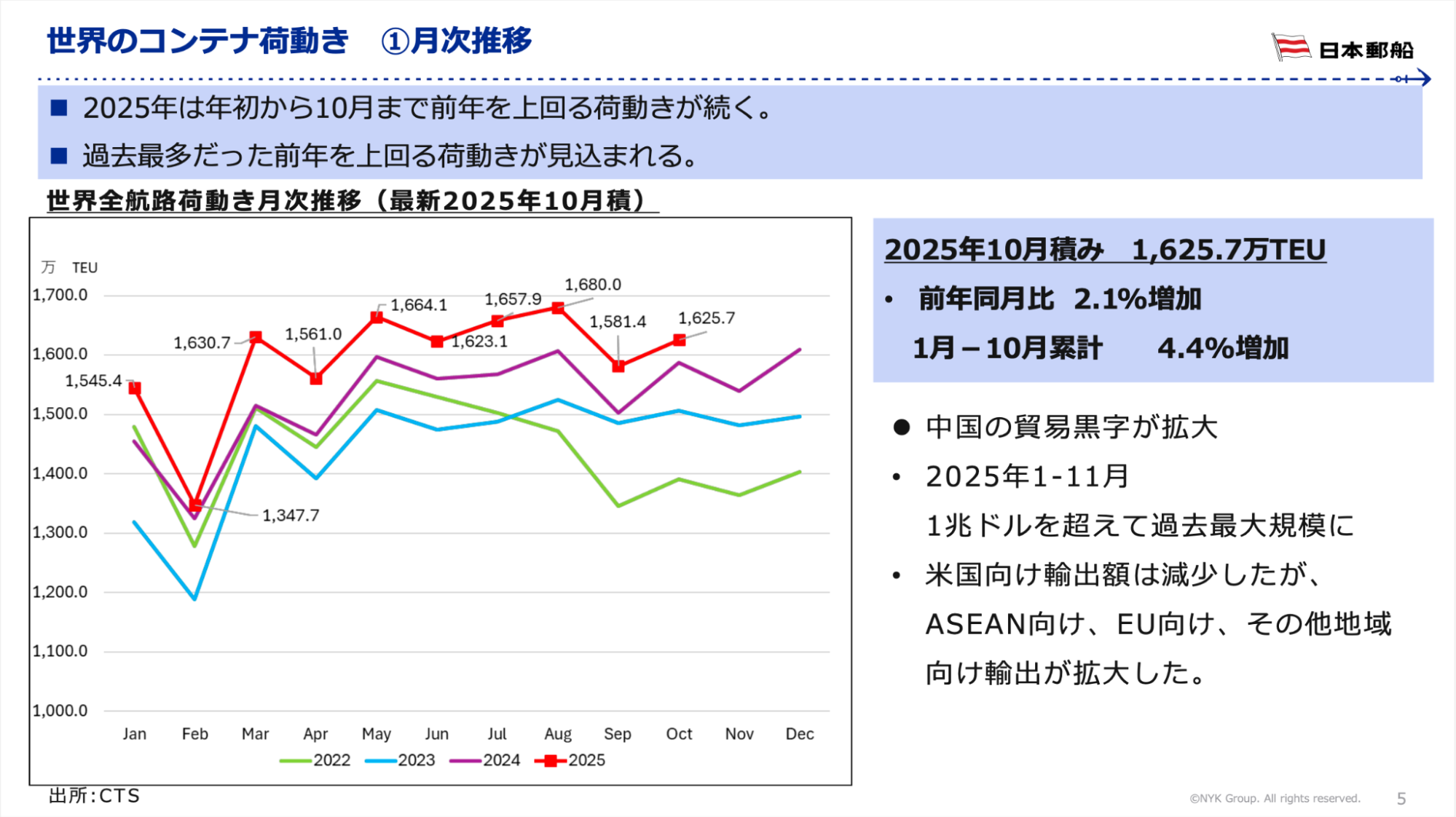 世界全体の2025年のコンテナ荷動きは、8月に過去最多を記録しました。関税により年初は荷動きの減速が予想されましたが、中国の輸出貨物が増加したことにより、増加率は当初予想を上回りました。