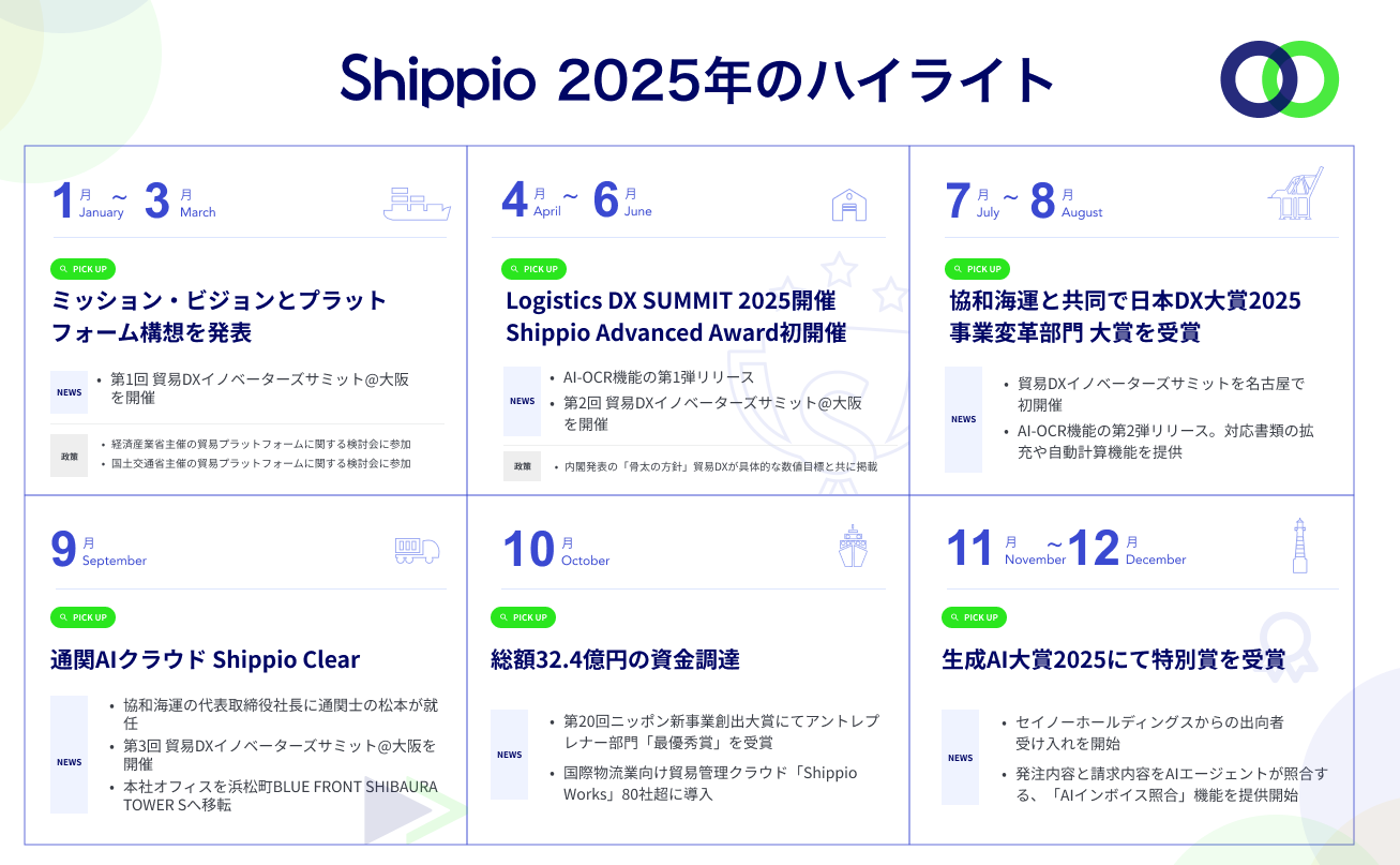激動する貿易領域において2025年、Shippioは単なる業務効率化ツールを超え企業のサプライチェーン戦略に寄与するプラットフォームへと進化すべく、あらゆる角度から活動を推進してまいりました。特に象徴的な出来事をピックアップいたします。