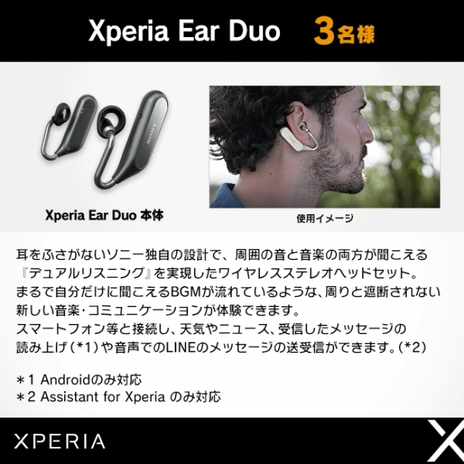 ・Xperia Ear Duo(ブラックまたはゴールド) 3名様(※色は選べません)