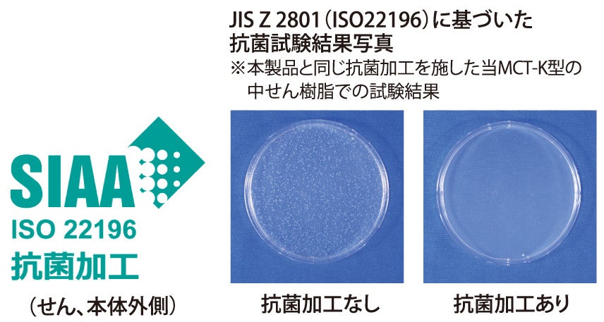 (※1)抗菌加工されていない製品の表面と比較し、細菌の増殖割合が百分の一以下であり、耐久性試験後も抗菌効果が確認されること。抗菌性は国際標準ISO22196に準じて行われた試験の結果にもとづいて判定されます。