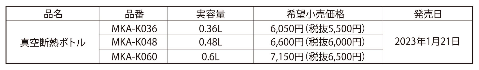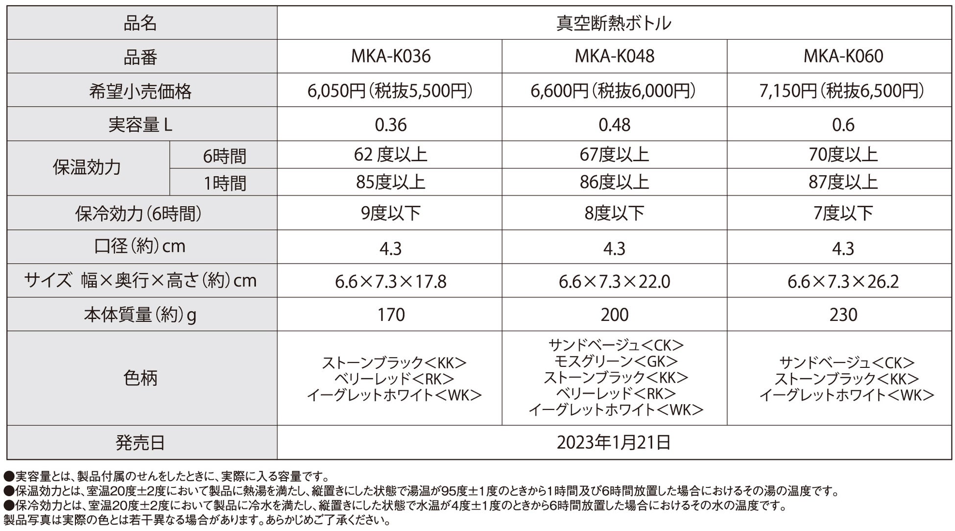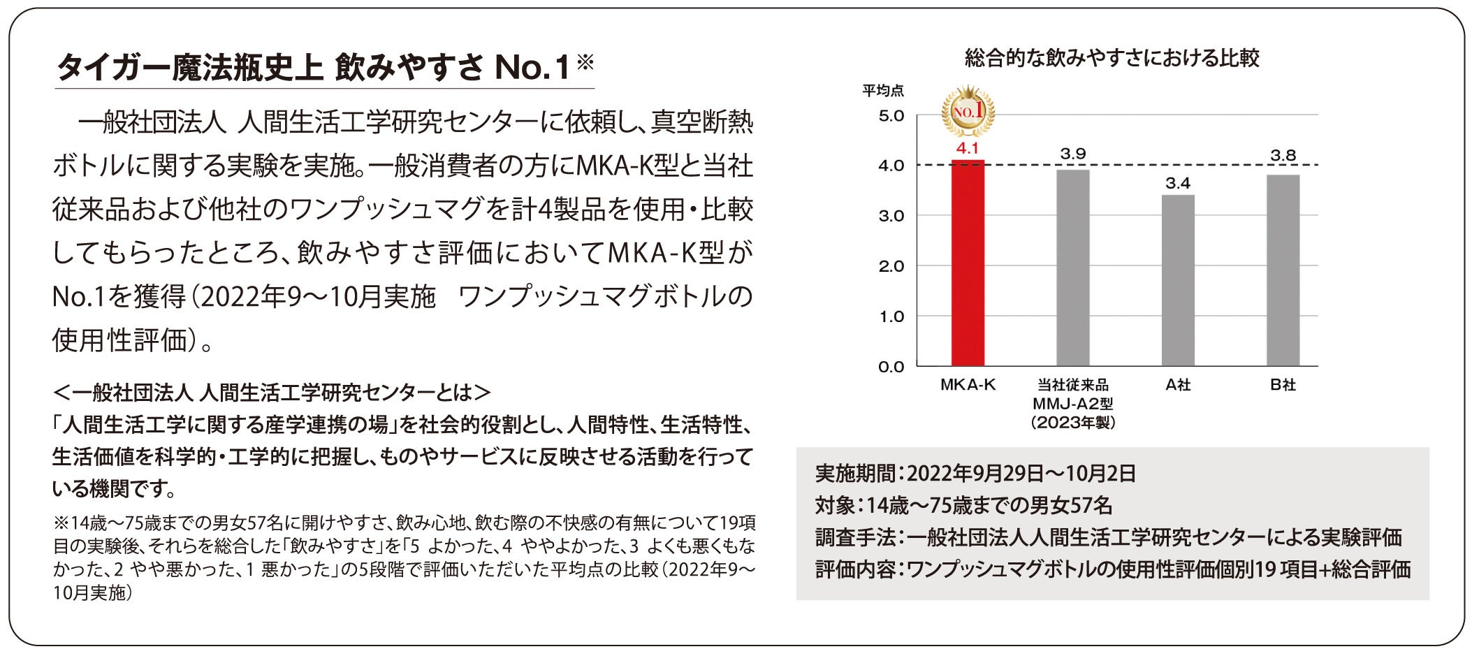 タイガー魔法瓶史上 飲みやすさ No.1!※1 飲みやすさを極めた※2 ワンプッシュマグが登場 真空断熱ボトル MKA-K036/K048/K060 2023年1月21日発売