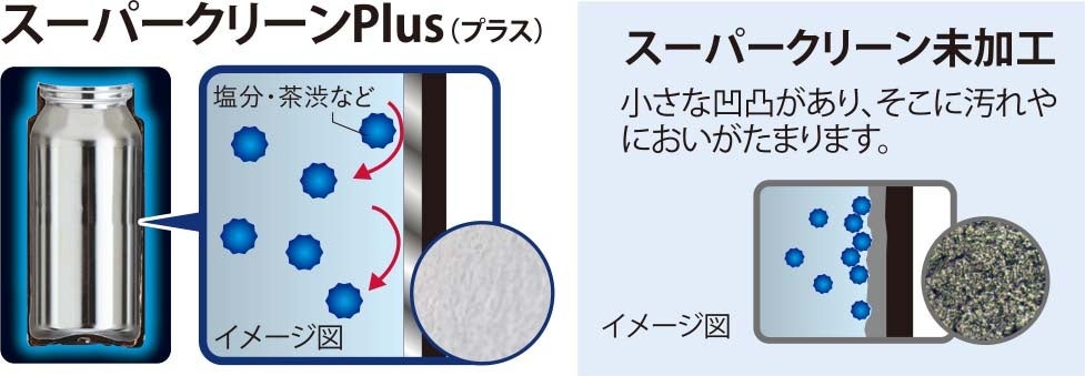 せんと本体外側には抗菌加工を施し、ボトル内面には、フッ素コートを使用しない当社独自の電解研磨技術「スーパークリーンPlus(プラス)」加工を採用。汚れやにおいがつきにくくなっており、毎日のお手入れを手間なく行っていただけます。