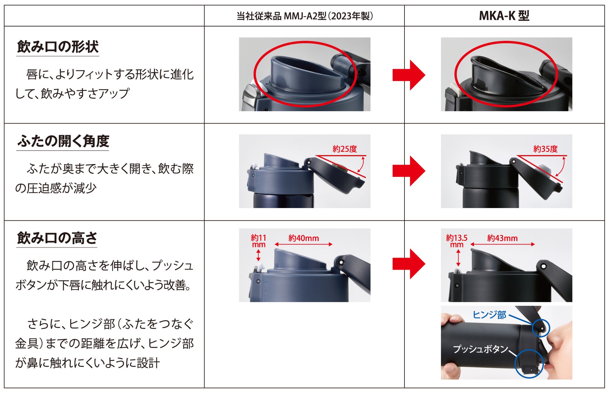 MKA-K型は、当社従来品 MMJ-A2型(2023年製)から構造を細かく見直し、さらに快適な飲み心地を実現。