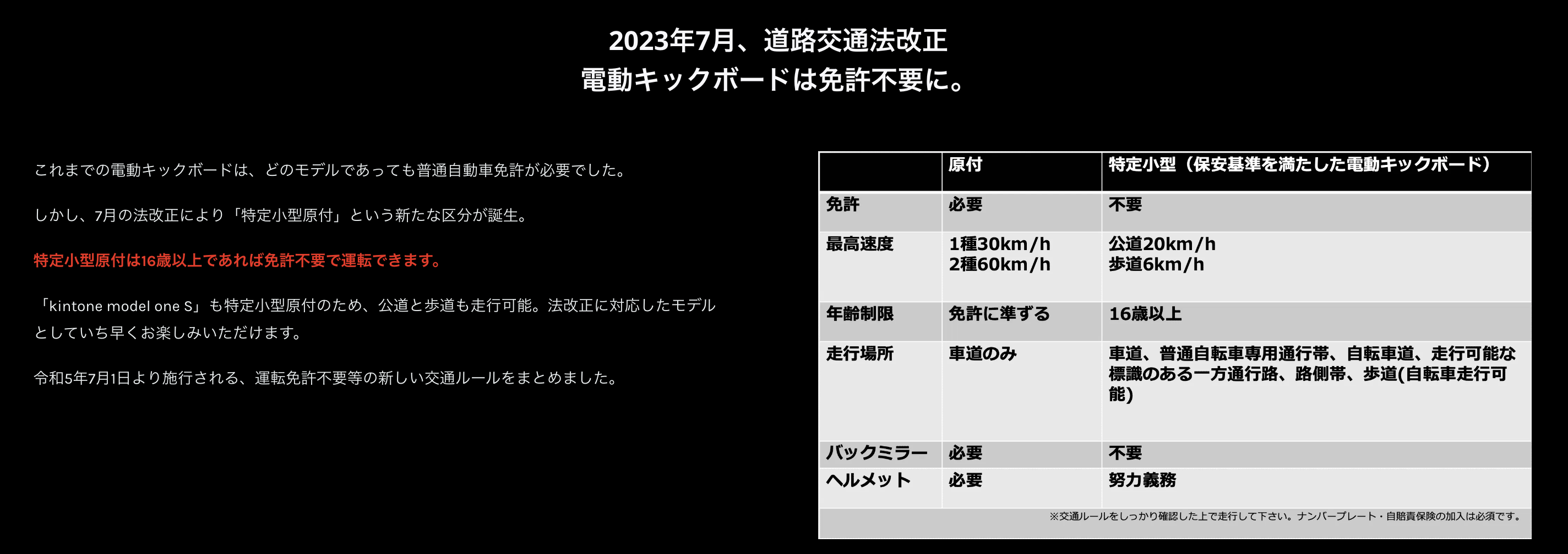 今回の改正道路交通法の施行に合わせ、以前から開発を進めていた新しい法律に適合する「Kintone model one S」の発売を決定しました。現行モデルのパワフルさを引き継ぎつつ、公道走行可能でより手軽に乗れるように設計しました。