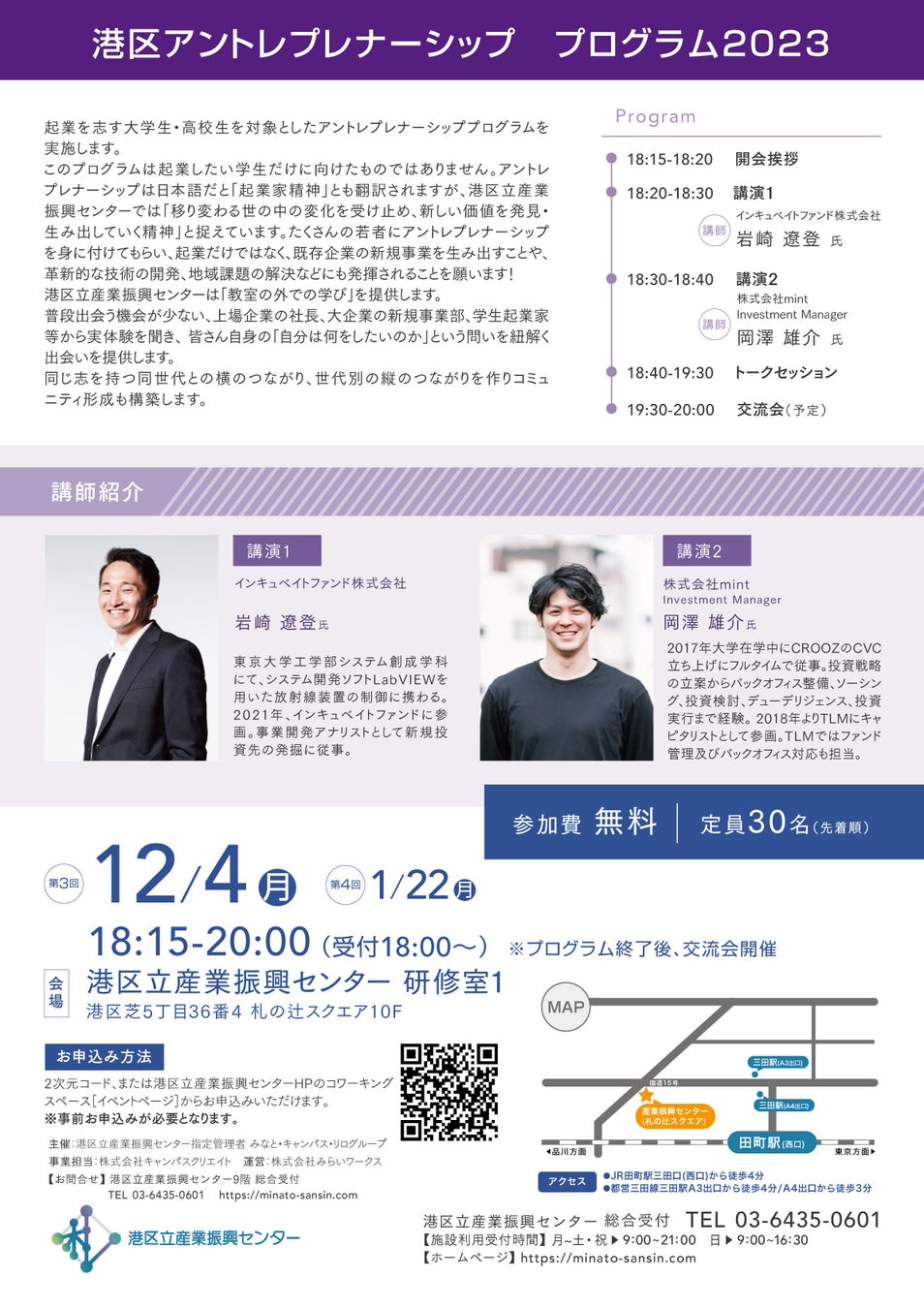 【港区で起業しよう。】第3回は2023年12月4日(月)開催。今回は現役VCの方々にお話しいただきます。
