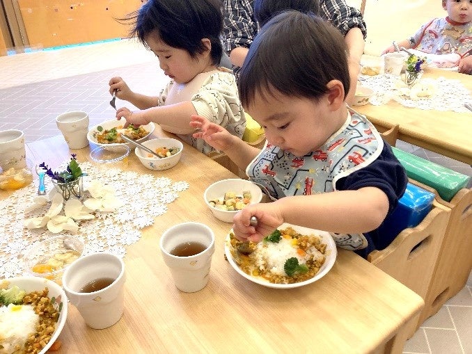 当日は、子どもたちも給食を楽しんでいる様子で、1歳児クラスではみんなスプーンを上手に使ってほおばっており、「にんじんが星の形でかわいい!」や「美味しかったー!」といった言葉が多く聞かれました。先生たちからも、「子どもたちはカレーが大好きなので、今日は特によく食べている」といった言葉もあり、にじいろ給食を楽しんでいる様子がうかがえました。