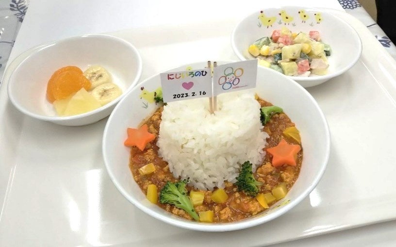 2022年末に「にじいろ保育園」の園児を対象として実施したアンケートでは、家で食べる好きな食べ物・保育園の給食で食べる好きな献立ともに、1位はカレーライスとなりました。園児が最も好きな献立から食に興味を持たせたいとの思いから、「にじいろの日」ではメインに「にじいろカレー」を取り入れた「にじいろ給食」の提供をスタートしました。その他、にじいろサラダ、キラキラフルーツゼリーなど見た目から子どもたちの興味をひく献立を企画しています。