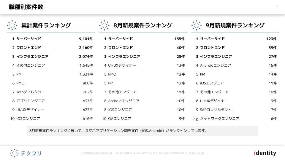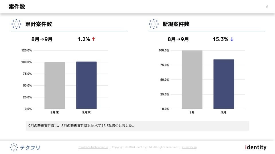 ITフリーランスエンジニアの案件・求人サイト「テクフリ」(https://freelance.techcareer.jp/)を運営する株式会社アイデンティティー(東京都新宿区、代表取締役:今野 力、以下「当社」)は、テクフリのデータベースをもとに2024年9月における案件の市況感を調査しました。より詳しい結果については、お問い合わせから資料請求が可能です。