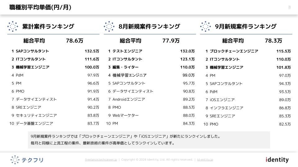 9月新規案件ランキングでは「ブロックチェーンエンジニア」や「iOSエンジニア」が新たにランクインしました。