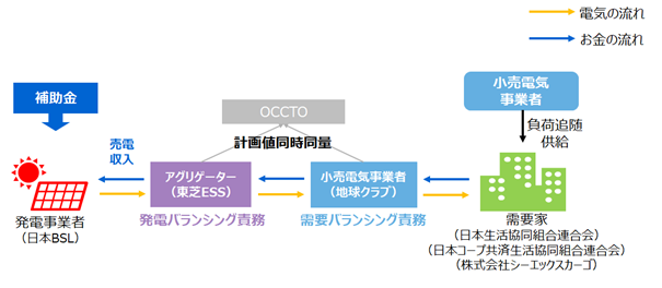 このたび、発電事業者である日本BSL株式会社(以下、日本BSL)が発電する再エネ電力を、小売電気事業者である株式会社地球クラブ(以下、地球クラブ)に供給する事業が、経済産業省による令和3年度補正予算「需要家主導による太陽光発電導入促進補助金」に採択されました。本事業において運転開始後は、東芝エネルギーシステムズ株式会社(以下、東芝ESS)がアグリゲーターとして参画し、東芝ESSがインバランスリスクを負担しながら小売電気事業者を通じて日本生活協同組合連合会をはじめとした需要家に再エネ電力を供給します。