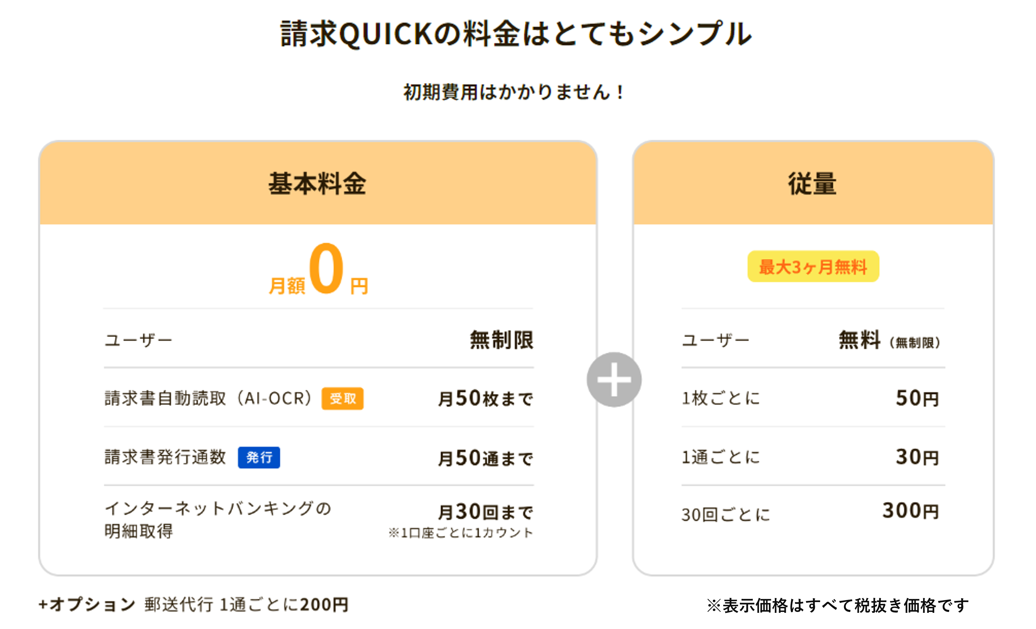 「請求QUICK」は、法制度対応と業務効率化を実現するクラウド型請求書管理システム(SaaS)をベースに3つのFinTech機能が組み込まれており、月額無料からご利用いただくことができます。金融機関とのAPI連携による自動明細取得機能で面倒な入出金の消込作業を大幅に効率化する「消込QUICK」、発行した請求書をクレジットカードでオンライン決済できる「クレカQUICK」、発行した請求書をWeb完結で資金化できるオンラインファクタリング「入金QUICK」という3つのFinTech機能を、すべて1つのシステムで提供しています。