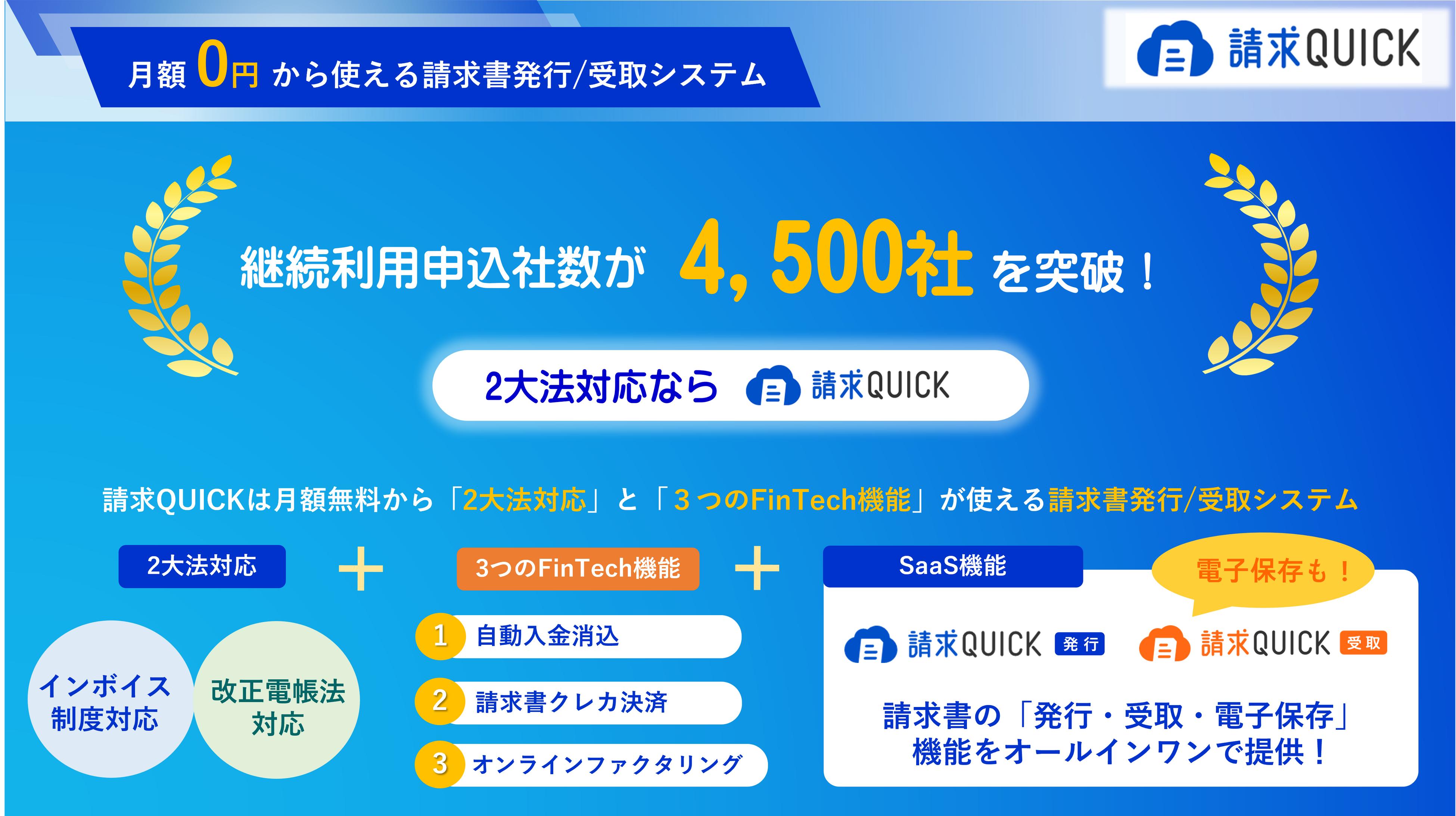 総合フィンテックソリューション企業であるSBI FinTech Solutions株式会社の子会社で、バックオフィス支援サービスを提供するSBIビジネス・ソリューションズ株式会社(本社:東京都港区、代表取締役社長:夏川 雅貴、以下「当社」)は、中小企業のインボイス制度対応と業務効率化をサポートするクラウド型請求書管理システム「請求QUICK」において、継続利用のお申し込み社数が4,500社を突破しましたので、お知らせいたします。