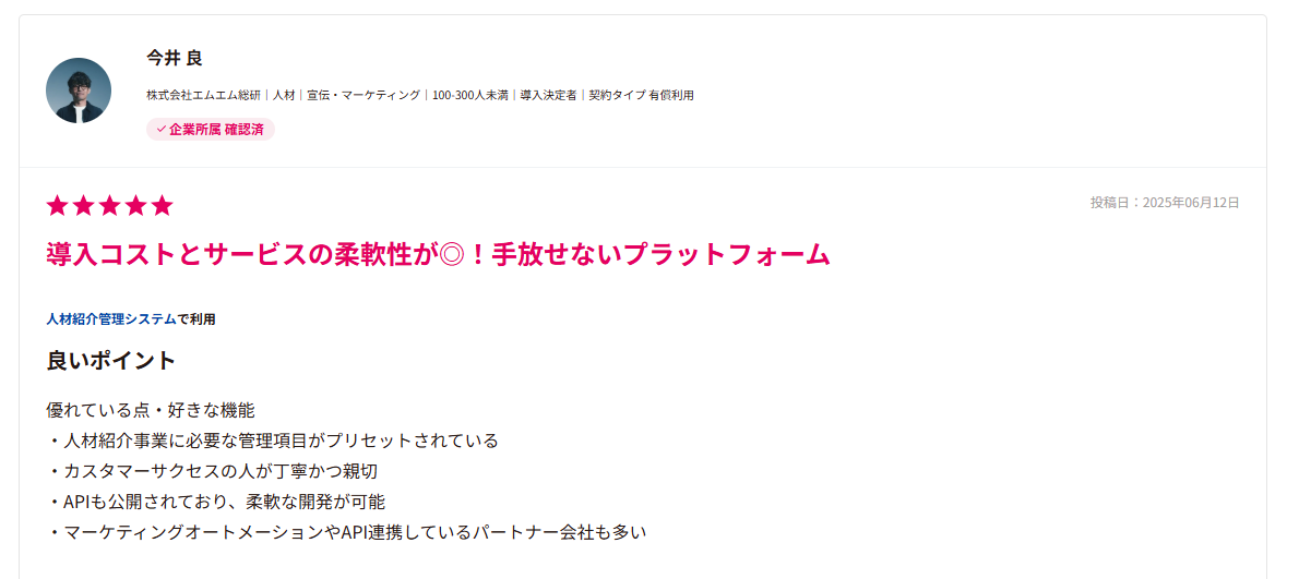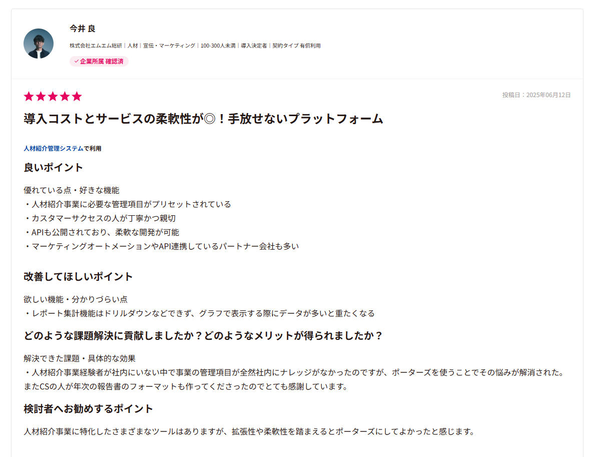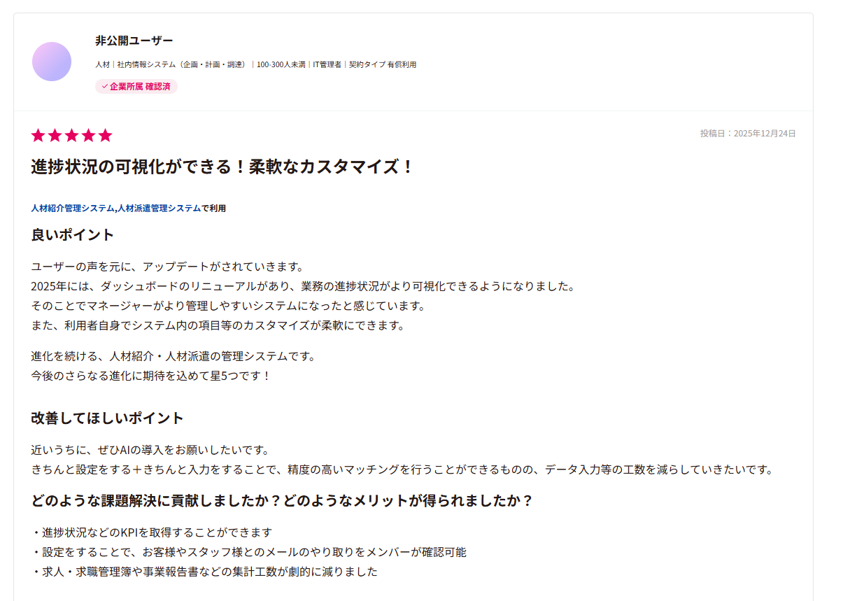 人材業務の一元管理と高精度マッチングが高評価。KPI可視化による業務改善で売上向上に寄与、ユーザーの声を反映した継続改善も支持