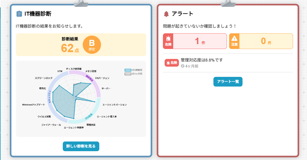 プロサポカルテを通して、IT機器の健康状態の可視化と、効率的かつ安全な管理を実現することができます。