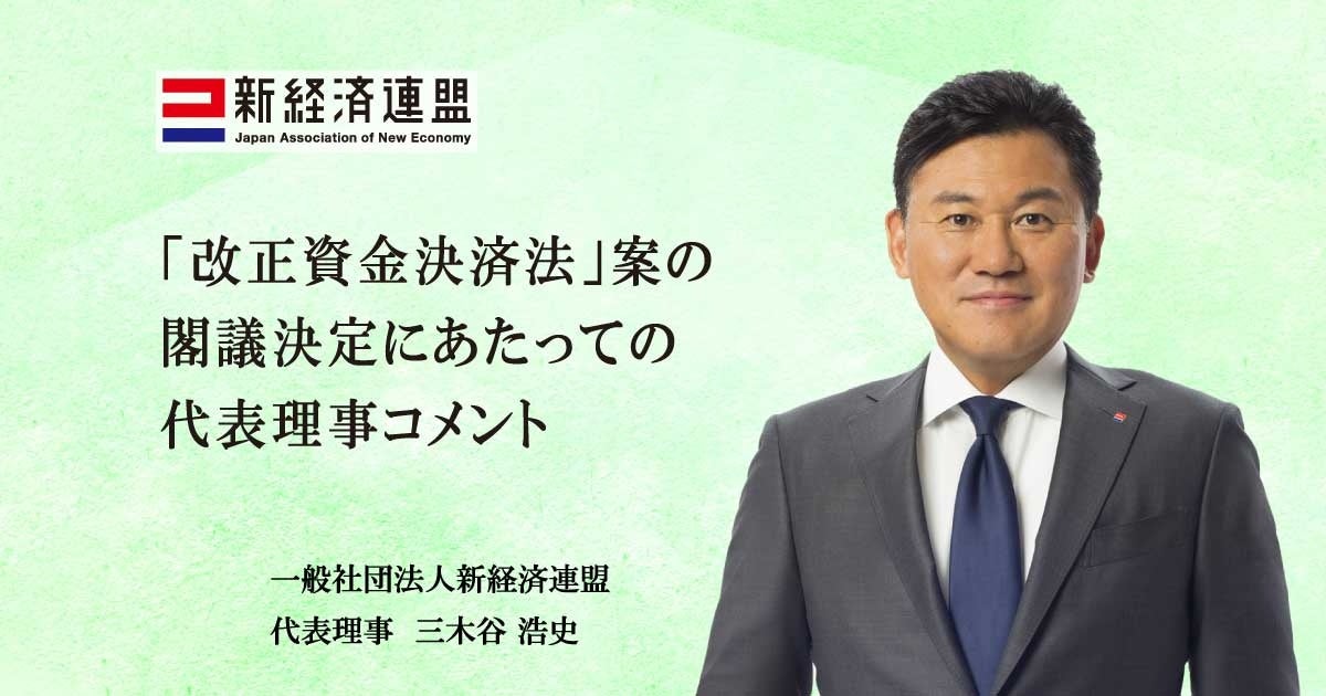 一般社団法人新経済連盟(所在地:東京都港区、代表理事:三木谷浩史、以下「新経連」)は、「改正資金決済法」案の3月7日付閣議決定を受けて、代表理事のコメントを発表します。