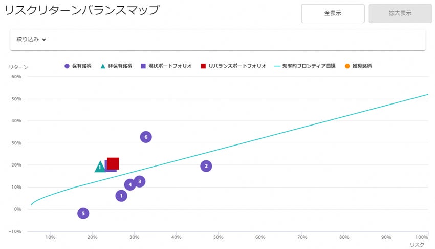 milizeAMは、お客さまの運用ポートフォリオのリスク・リターンの数量分析、追加購入 による最適化等のアドバイスが可能なツールです。ポートフォリオ理論に基づくリスク・リターン分析を通じ、資産の最適化や商品選定 の正しいアドバイスをサポートします。現在保有している資産の予想最大損失額やモンテカルロシミュレーション方式を使用した計算結果による将来収益を予想することも可能です。ポートフォリオの見直しシミュレーションを行い、リスク・リターンの改善効果を見ることができます。