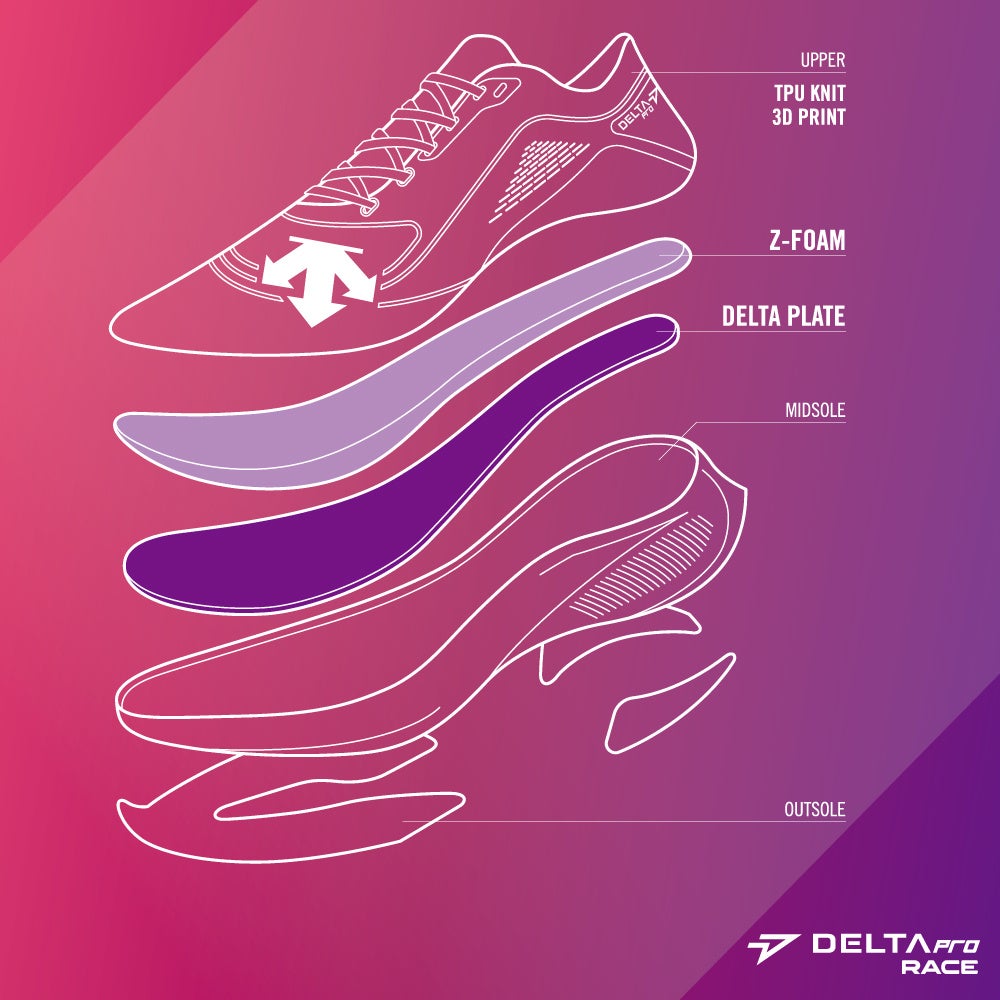 昨今、ソールの反発性による推進力が記録を狙うランナーに人気の厚底カーボンランニングシューズですが、その反発性があることで、着地の際に脚が横にぶれてしまったり、姿勢が崩れやすいのが課題でした。今回『デサント』から発売する「デルタ プロ レース」は、「ともに走れ。もっと速く。」をコンセプトに、「フルマラソンで記録を狙いたいが厚底カーボンシューズを履きこなせるか不安」と感じていたランナーでも履きやすいよう、推進力を生み出すカーボンプレートと、安定感を生み出すアウトソール構造のバランスにより、厚底カーボンの推進力を活かしながら課題を解決したランニングシューズです。