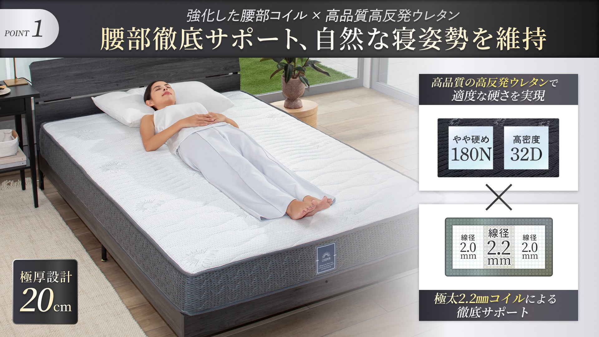 デスクワークや力仕事で疲れた腰を、独自の硬さ設計で徹底サポート。腰部には極太2.2mmのコイルを使用し、正しい姿勢を維持します。目に見えない内部まで高品質高反発ウレタンを採用しており、適度な硬さで沈み込みすぎずしっかりと体を支えてくれます。朝すっきり目覚め、日中の活力をサポートします。