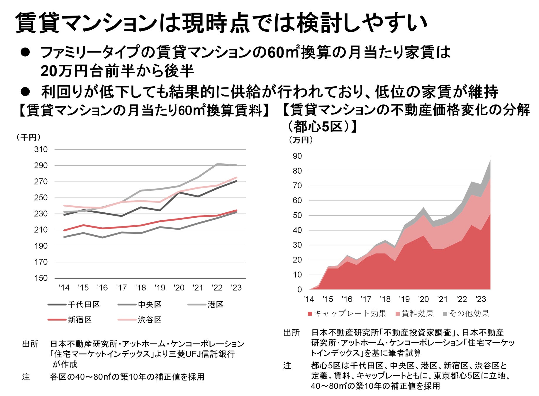 都心において新築マンションの代替となってきた中古マンションだが、パワーカップルにとっても価格上昇に追随しにくい状況となりつつある。今後は相対的に割安感のある賃貸マンションへの選好が強まるだろう。さらには、従前以上に都心5区以外の都区部、郊外への流出も想定される。
