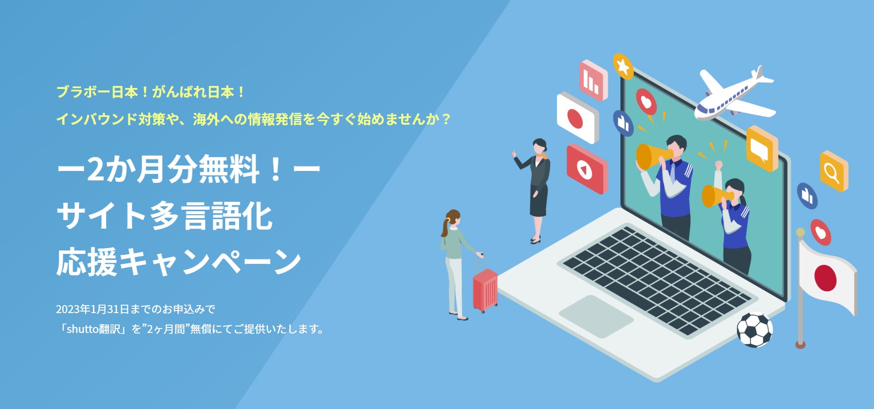 Webサイト翻訳ツール「shutto翻訳」について、2023年1月31日(火)までにお申込みいただいた方は、2か月分の月額費用を無料でご提供させていただきます。