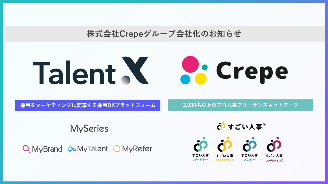 株式会社TalentX(本社:東京都新宿区、代表取締役社長CEO:鈴木 貴史、証券コード:330A、以下「当社」)は、2,000名を超えるプロ人事フリーランスネットワークを保有し、企業の人事組織の変革をサポートする「すごい人事シリーズ」などを展開する株式会社Crepe(以下「Crepe」)の全株式を取得し、グループ会社化したことをお知らせいたします。