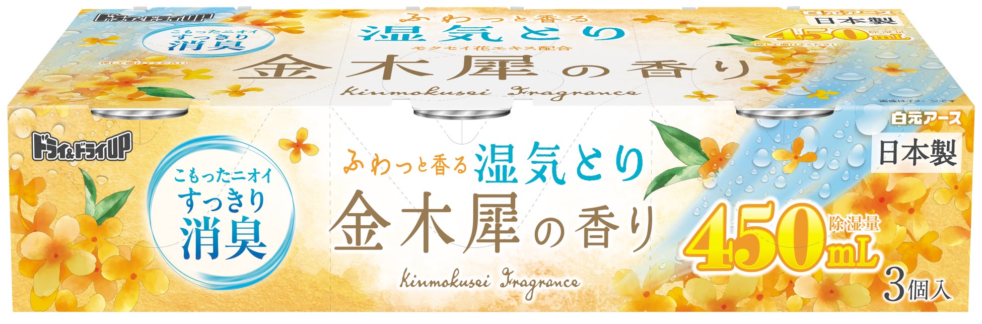 左から、ドライ&ドライUP 金木犀の香り 450mL、ドライ&ドライUP 引き出し・衣装ケース用 金木犀の香り、クローゼット・洋服ダンス用 金木犀の香り