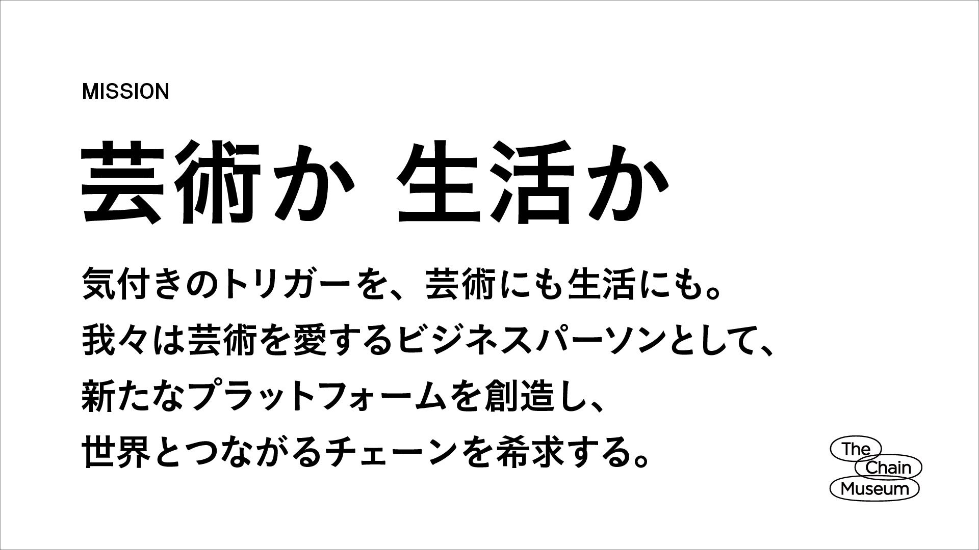 The Chain Museumは「気付きのトリガーを、芸術にも生活にも。」というミッションを掲げ、これまで、気付きのトリガーを世界中に伝播させるために、アーティストと鑑賞者の新しい関係性が生まれる場をつくる「ArtSticker事業」、生活の中にアートを散りばめるために、ホテルや商業施設、オフィスなどの空間プロデュースを行う「Coordination事業」、そして、アートとのより多様な関わり方を提案するために、自らが運営する「Gallery事業」を展開。デジタルとリアルを相互に駆使し、気付きのトリガーを伝播させてまいります。