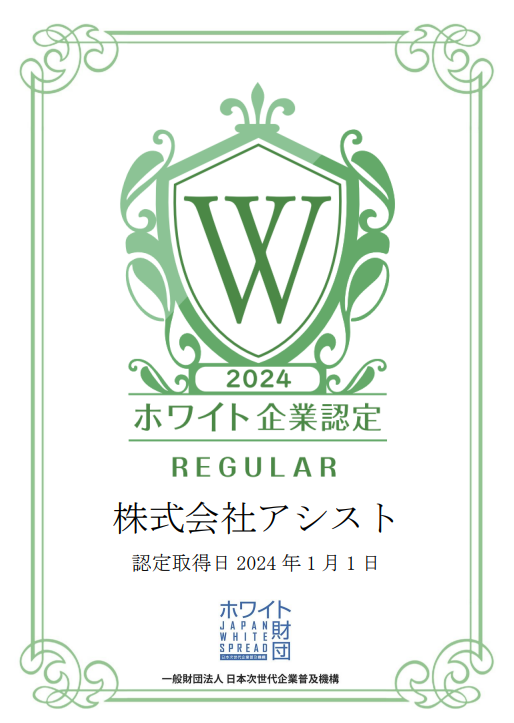 株式会社アシストは2024年1月1日に「ホワイト企業認定 レギュラーランク」を取得されました!