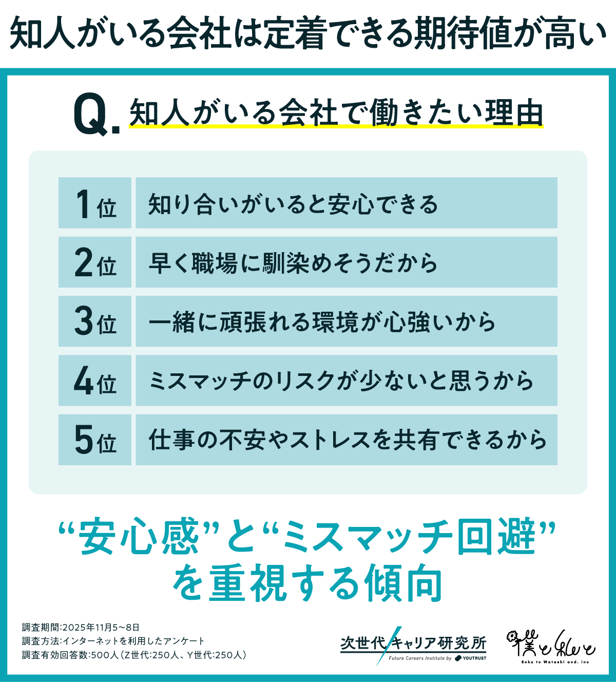 その理由としては、「知り合いがいると安心できるから」が26.3%で最多となりました。次いで「早く職場になじめそうだから」25.9%、「仲間と一緒に頑張れる環境が心強いから」25.0%、「ミスマッチのリスクが少ないと思うから」24.6%と続きます。