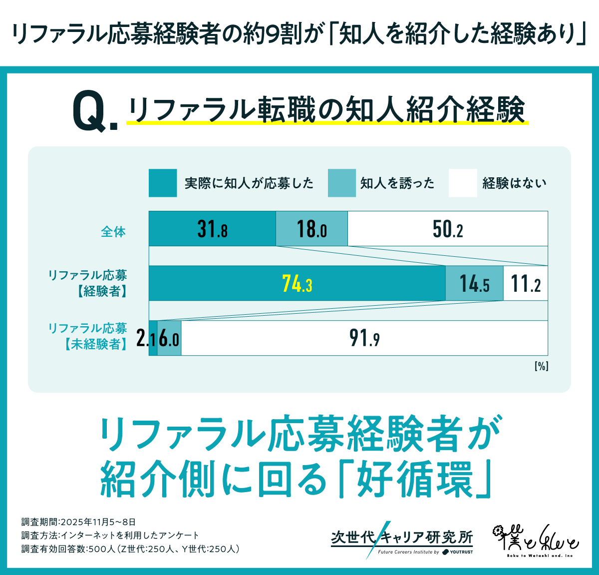 リファラル応募経験者の約9割が紹介する側にも回っており、良い転職体験が次の紹介につながる前向きなサイクルが期待できます。