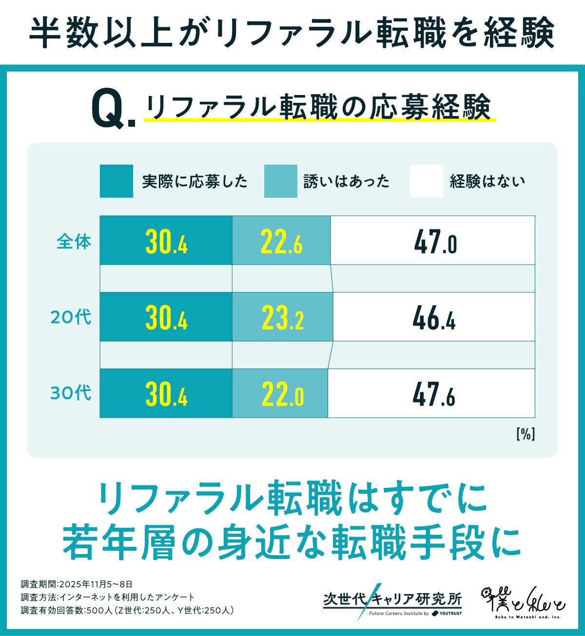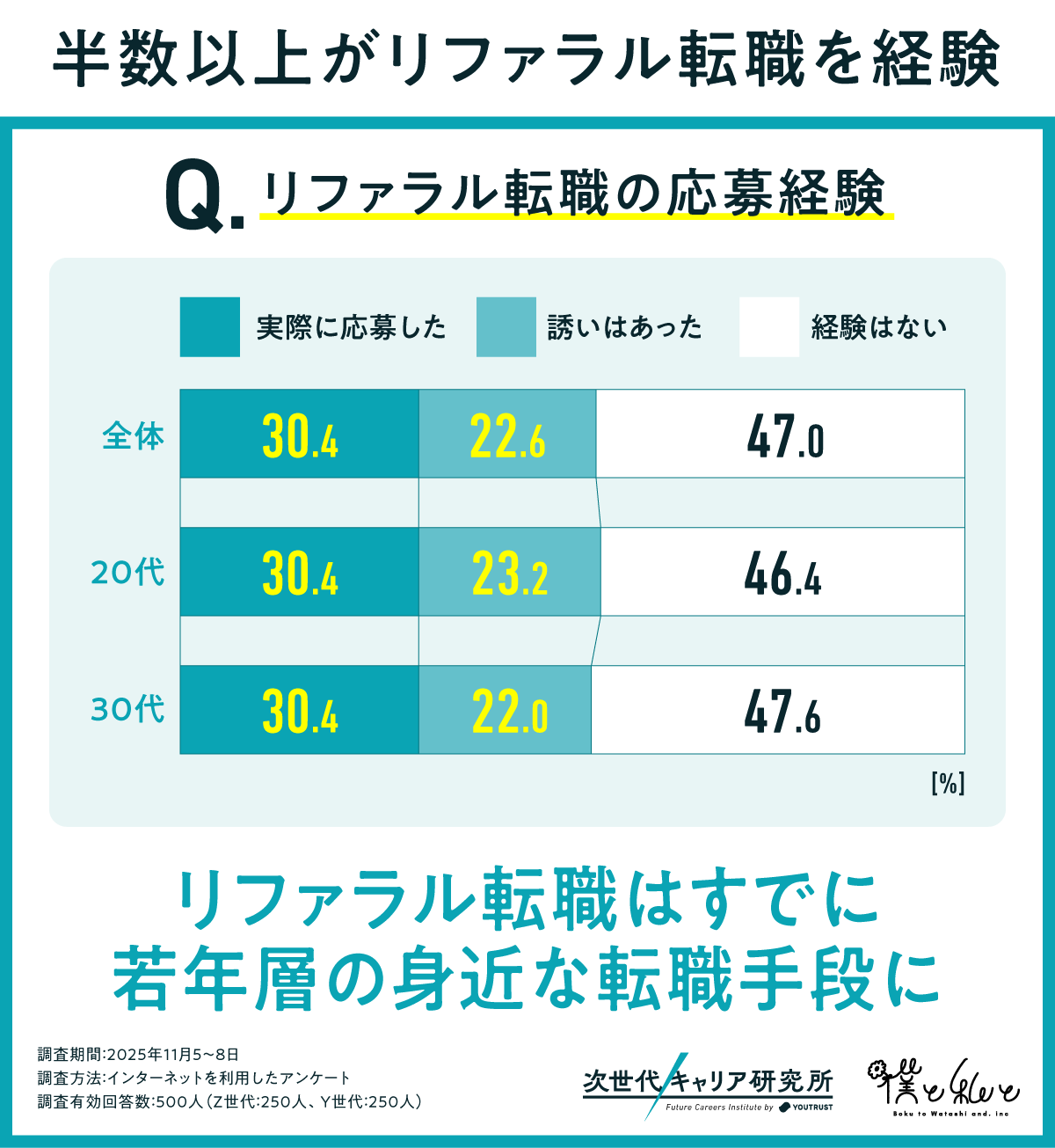 1. 半数以上がリファラル転職の誘いを経験。世代を問わず、転職手段として定着しつつある。
