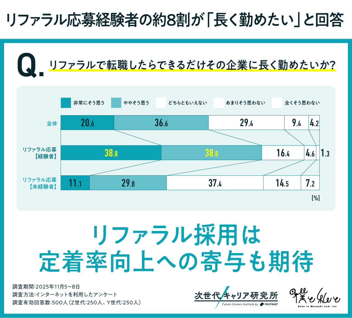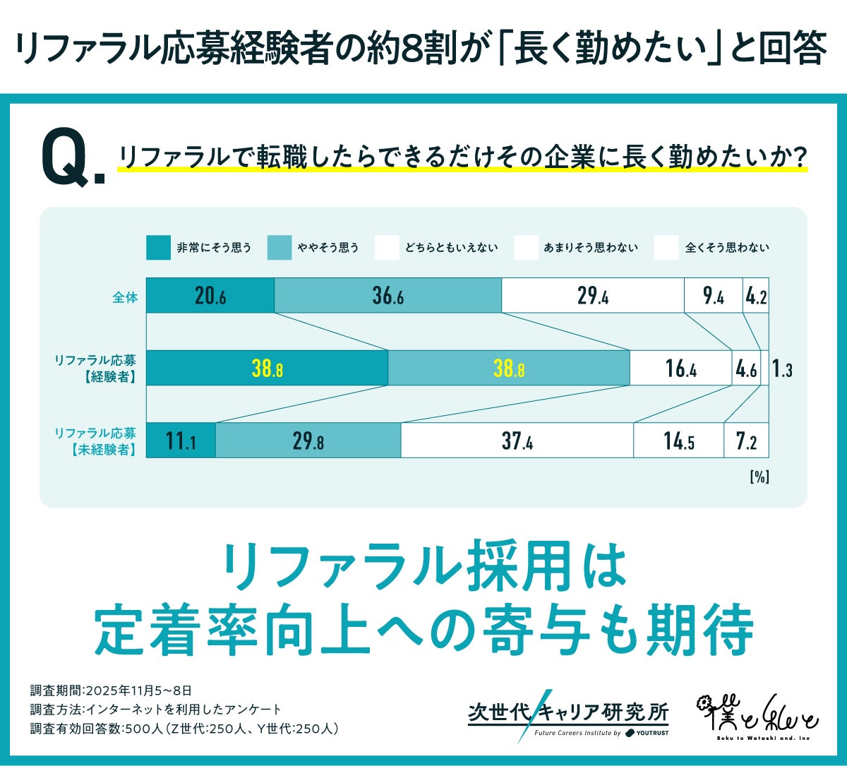 リファラル採用と入社後の定着意向の関係についても調査しました。