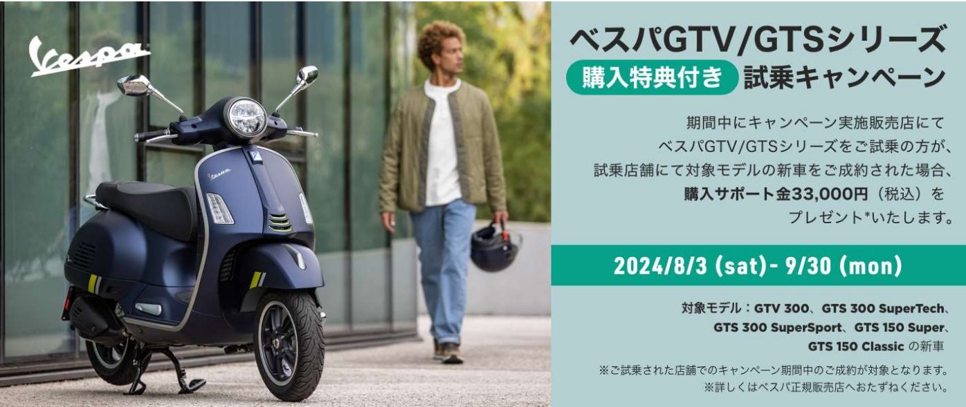 キャンペーン内容: 期間中にキャンペーン実施販売店にてベスパ GTV/GTS シリーズを ご試乗の方が、期間中に試乗店舗にて対象モデルの新車をご成約された場合、 購入サポート金 33,000 円(税込)をプレゼント※いたします。