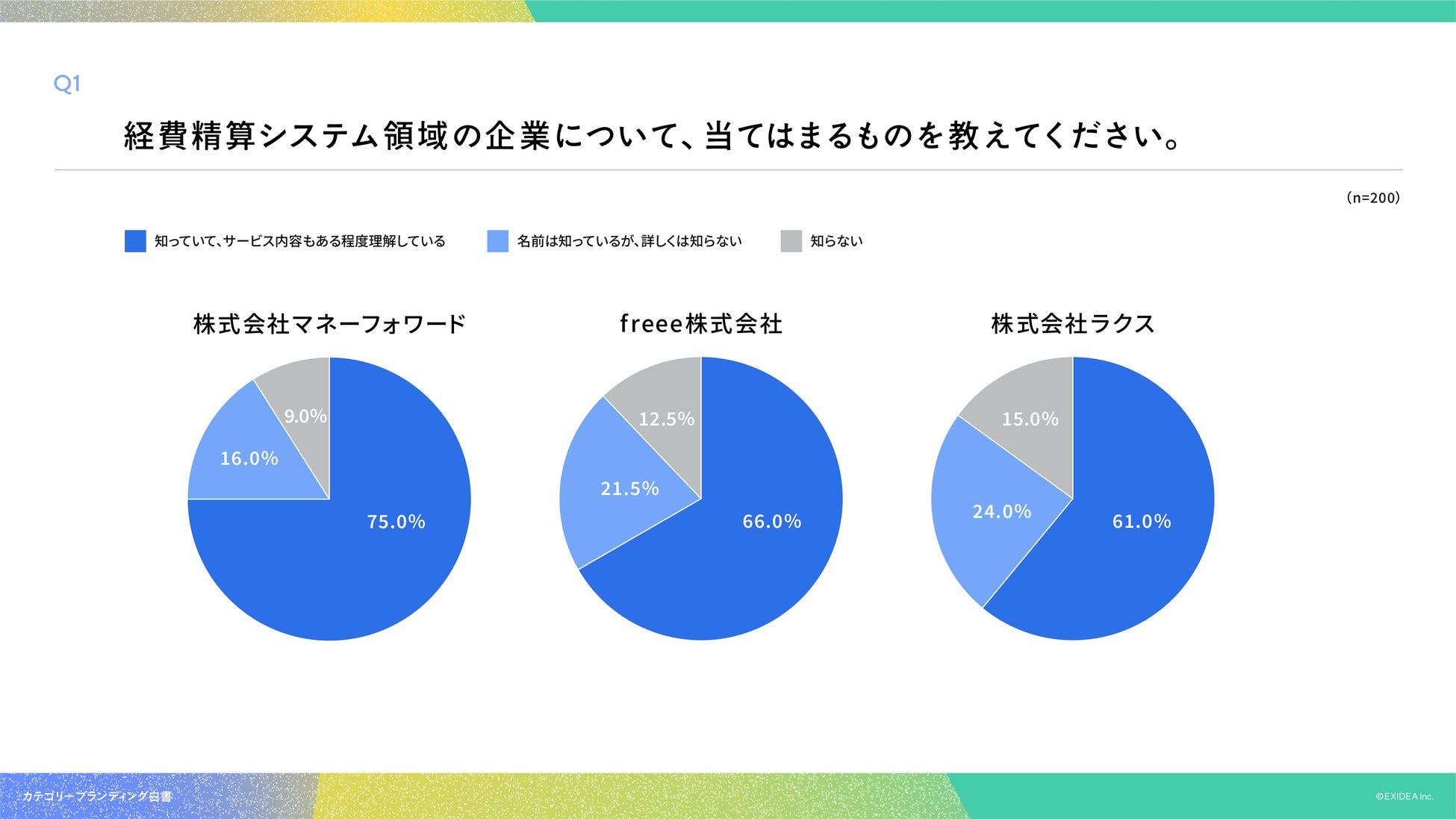 「Q1. 経費精算システム領域の企業について、当てはまるものを教えてください。」(n=200)と質問したところ、株式会社マネーフォワードは「知っていて、サービス内容もある程度理解している」が75.0%、freee株式会社は「知っていて、サービス内容もある程度理解している」が66.0%、株式会社ラクスは「知っていて、サービス内容もある程度理解している」が61.0%という回答となりました。
