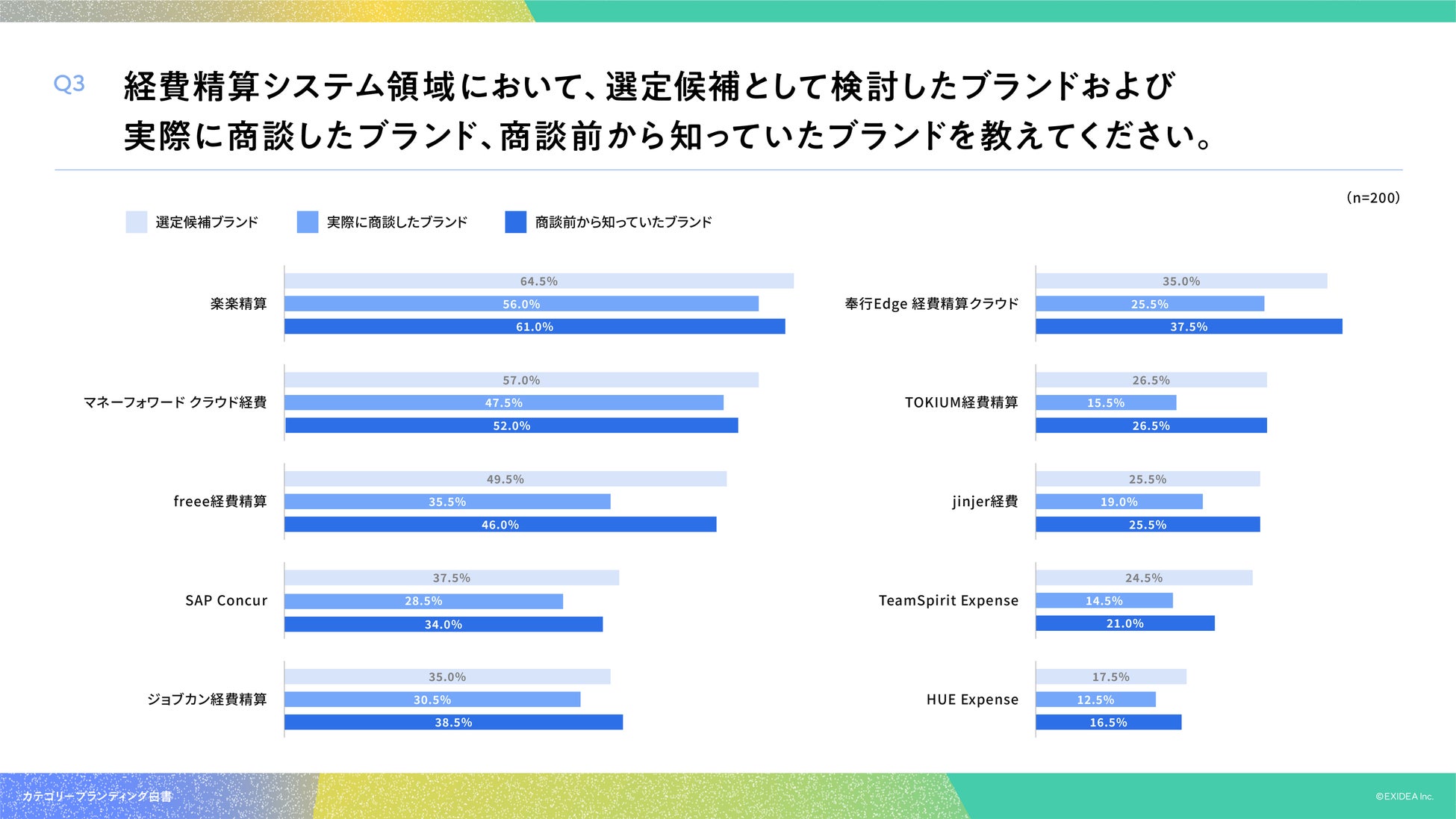 「Q3. 経費精算システム領域において、選定候補として検討したブランドおよび実際に商談したブランド、商談前から知っていたブランドを教えてください。」(n=200)と質問したところ、選定候補ブランドは「楽楽精算」が64.5%、「マネーフォワード クラウド経費」が57.0%、実際に商談したブランドは「楽楽精算」が56.0%、「マネーフォワード クラウド経費」が47.5%、商談前から知っていたブランドは「楽楽精算」が61.0%、「マネーフォワード クラウド経費」が52.0%という回答となりました。