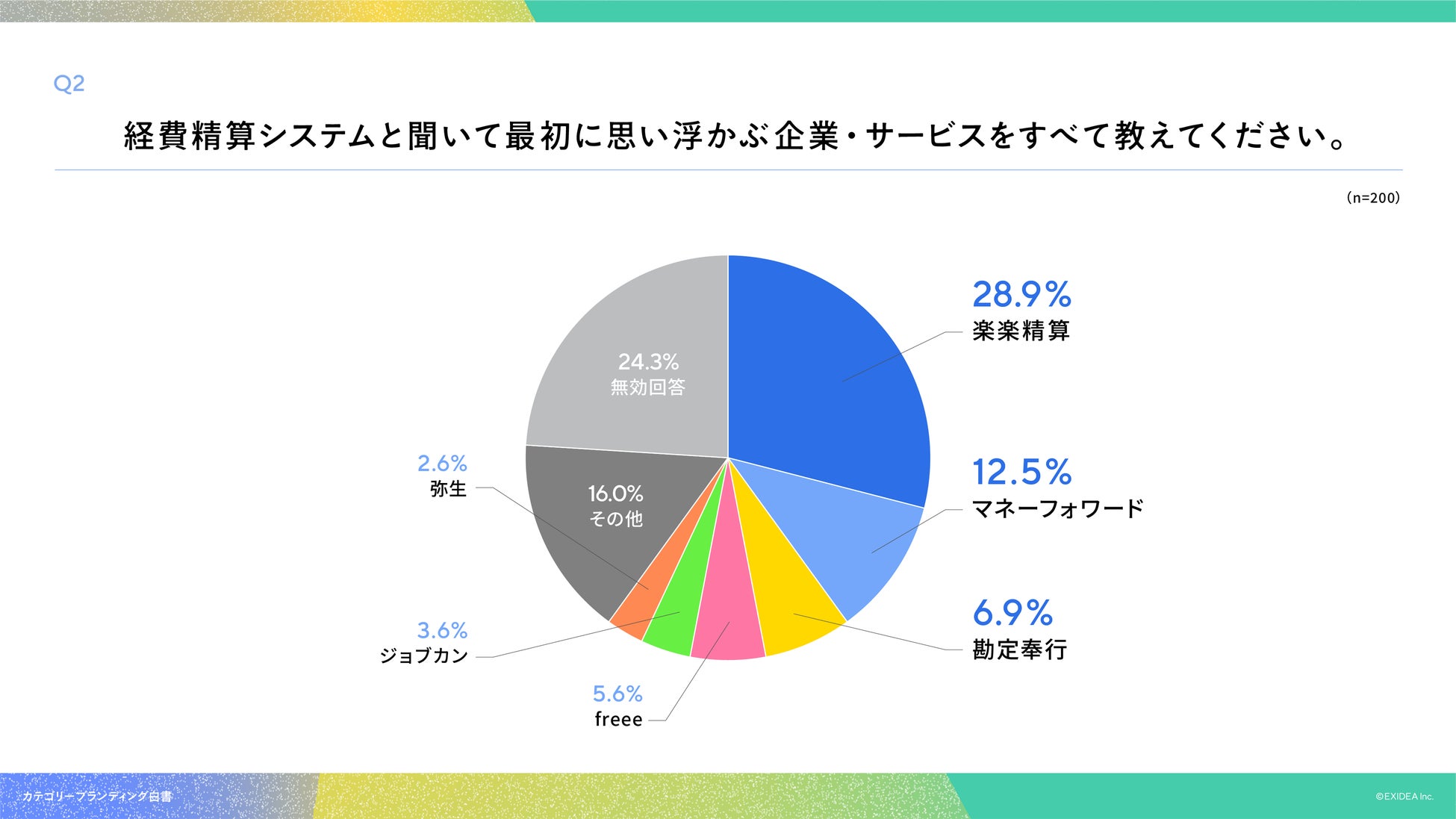 「Q2. 経費精算システムと聞いて最初に思い浮かぶ企業・サービスをすべて教えてください。(自由回答)」(n=200)と質問したところ、「楽楽精算」が28.9%、「マネーフォワード」が12.5%、「勘定奉行」が6.9%という回答となりました。