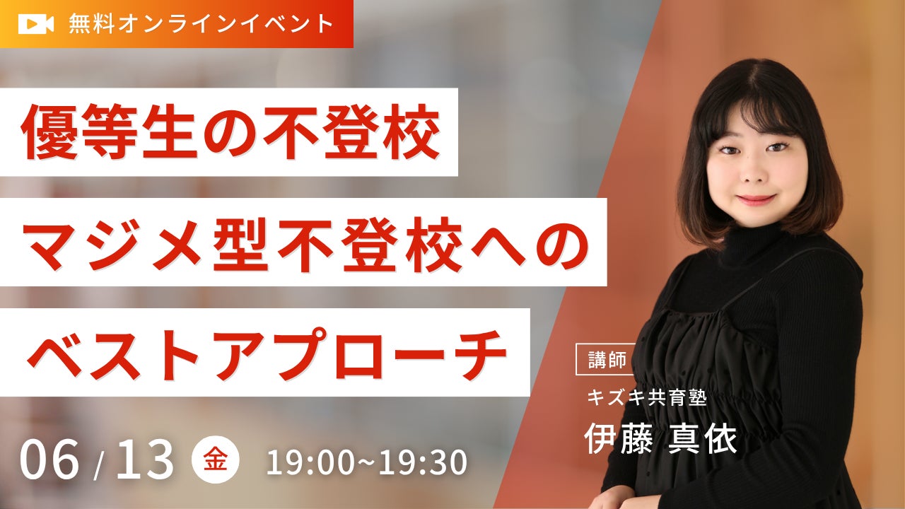 2025年6月13日(金)19:00~19:30、キズキ共育塾(※)は「真面目、優等生、頑張り屋さんタイプ」のお子さんの不登校に悩む保護者様を対象に、無料のオンラインイベントを開催します。