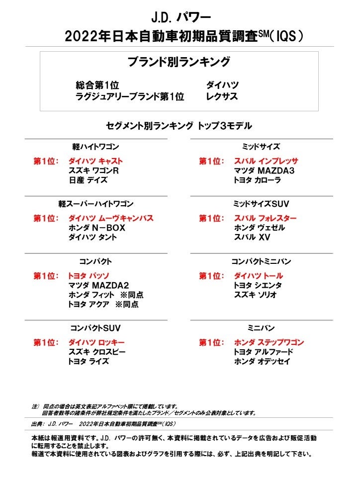 J.D. パワー 2022年 日本自動車初期品質調査 、各部門のNo.1を発表