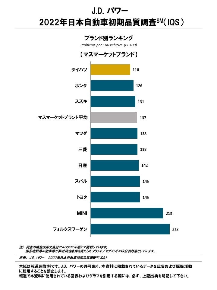 2022年の業界平均は138PP100(車両100台当たり138箇所の不具合指摘数)であり、2021年の137PP100とほぼ同水準だった。ランキング対象ブランド中、最も不具合指摘が少なかったのはダイハツ(116PP100)であった。ダイハツはセグメント別ランキングでも8セグメント中4セグメントで首位となった。ラグジュアリーブランドではレクサス(169PP100)の不具合指摘が最も少なかった。