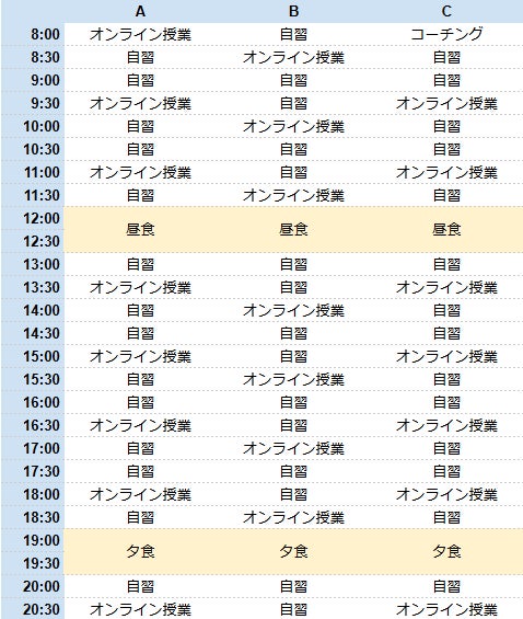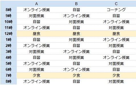 スケジュール例は以下画像のようになっており、A・B・Cの日程をそれぞれ4日程ずつ組み合わせます。