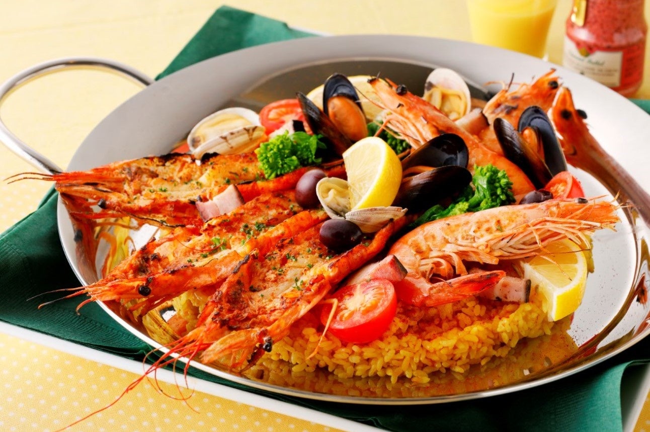 (左から)赤海老のパエリア、桜海老・抹茶の柚子風味トースト、海老つみれのおやき