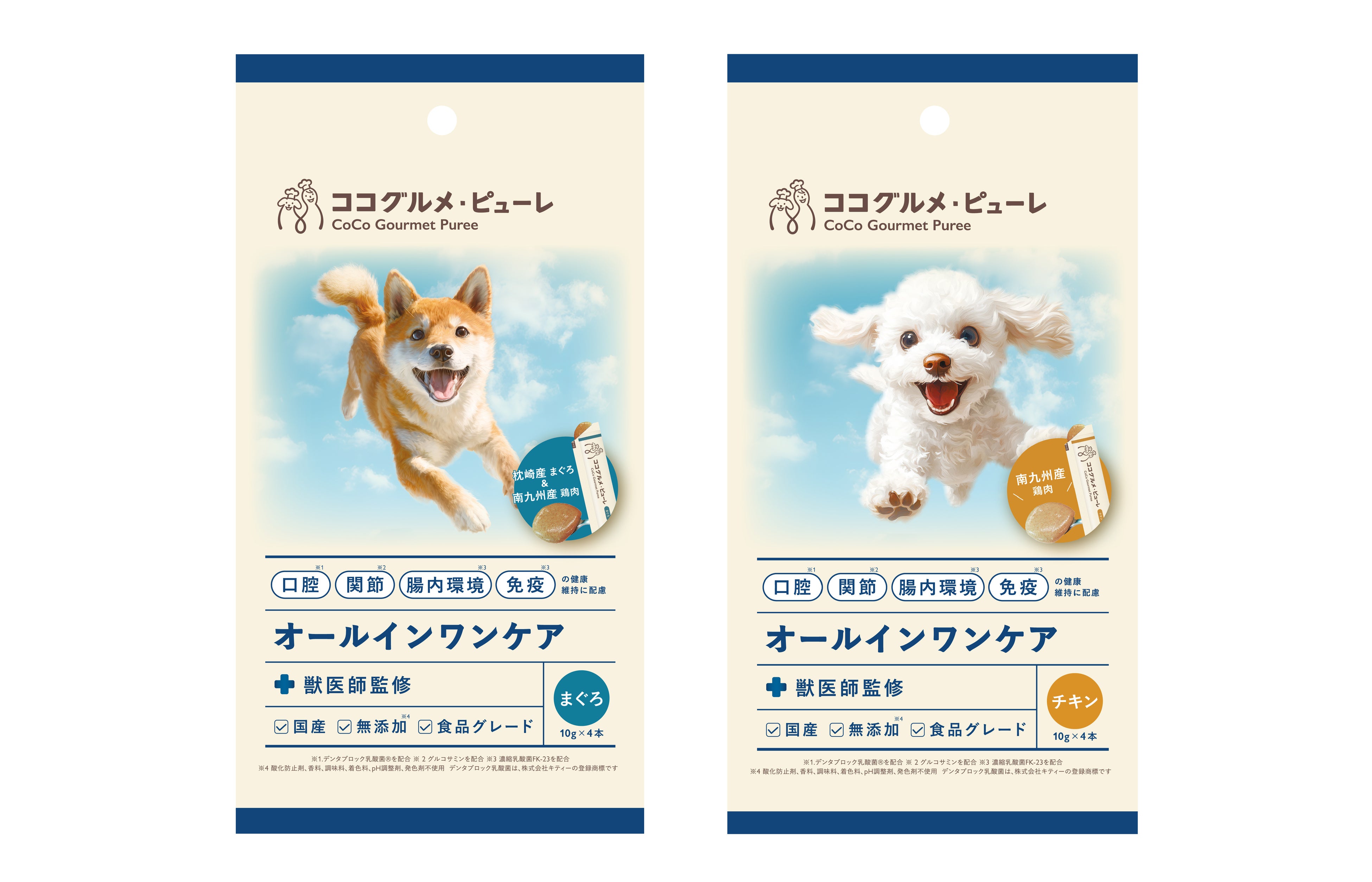 「ココグルメ・ピューレ」は、ココグルメや愛猫用ピューレ「ミャオグルメ にゃっち」で築いてきた、当社のどうぶつの食に対するものづくりの技術や姿勢をベースとしつつ、「口腔・関節・腸内環境・免疫」の健康維持に配慮した、無添加(※4)、獣医師監修の「オールインワンケア」ピューレです。