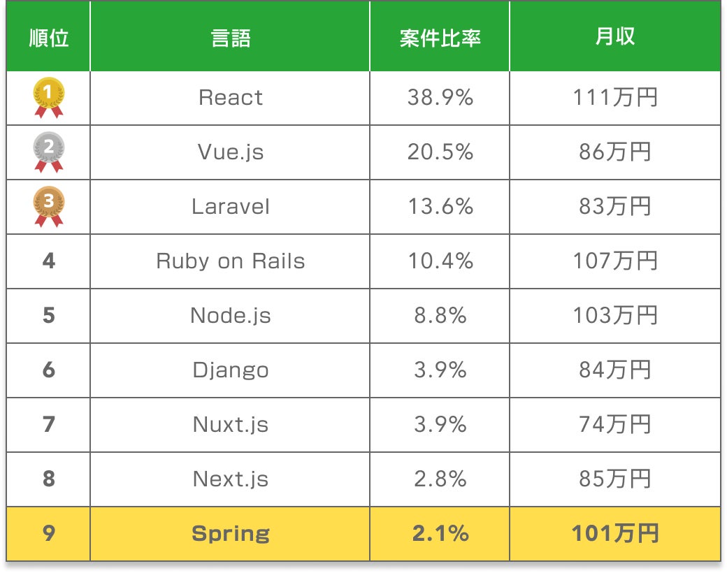 Spring案件の案件数は全体の2.1%を占めており、案件数ランキングでは9位という結果になっています。React(38.9%)やLaravel(13.6%)と比較すると案件数は限定的ですが、大規模エンタープライズシステムや金融機関など、特定の業界に特化した専門性の高い技術領域です。