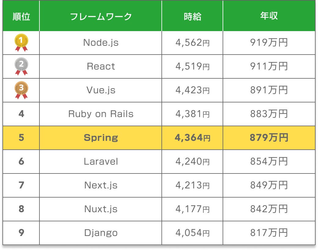 Spring案件では、平均年収が879万円となっており、フレームワーク年収ランキングでは5位という結果になっています。Javaエコシステムにおけるエンタープライズ系開発の市場価値の高さを明確に示しています。また大規模な基幹システム開発や金融系システムでのSpringの重要性と、そこで求められる高度な技術スキルが適正に評価されていることを表しています。