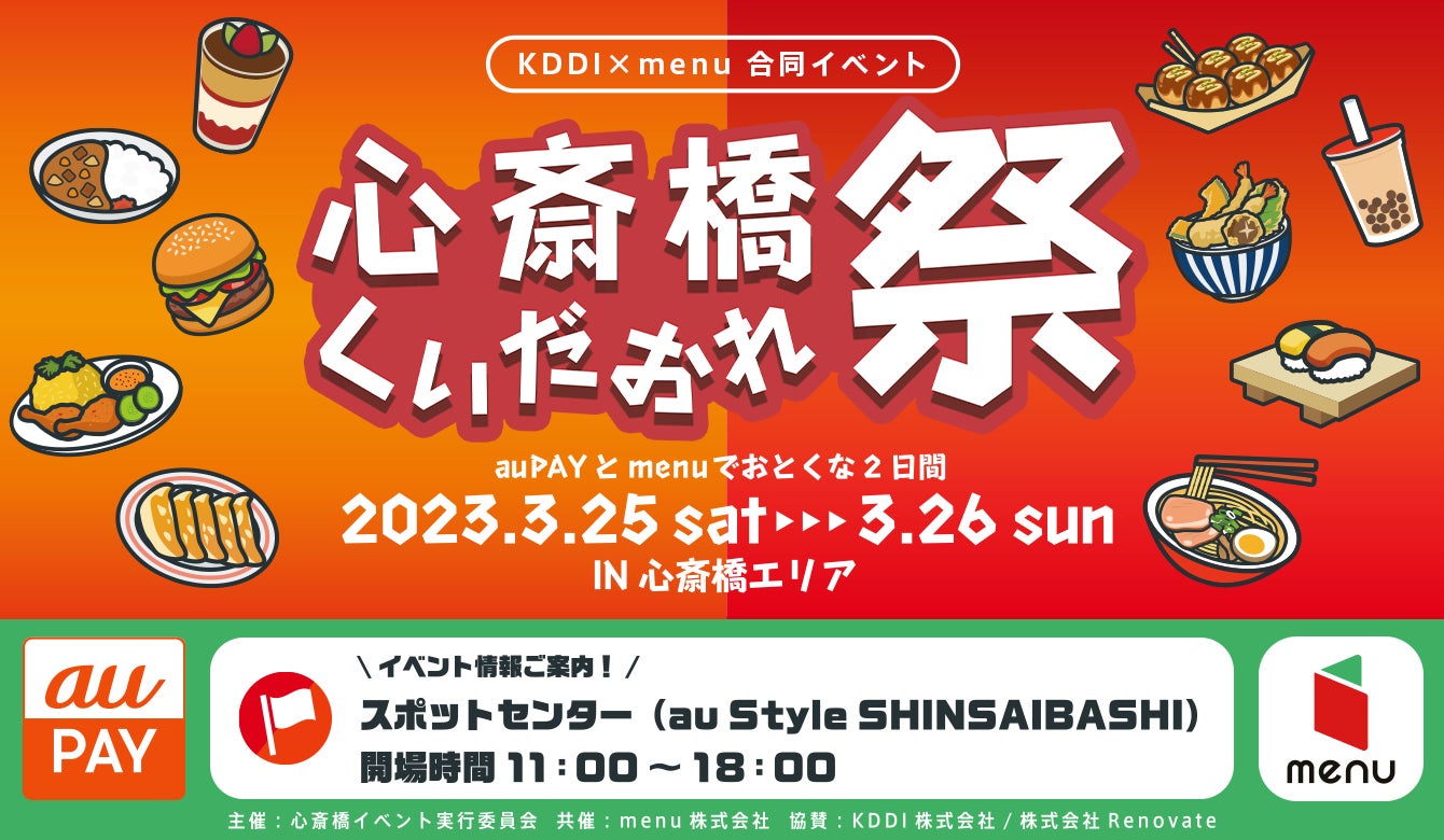 第五弾として大阪市中央区心斎橋エリア・大阪市西区堀江エリアで行う本イベントでは、3月25日(土)・26日(日)の2日間、現地のお店でお得にグルメが楽しんでいただける「心斎橋くいだおれ祭」を実施。イベント当日はau PAY決済でお支払いいただくと250円のクーポン利用でお得にグルメを楽しんでいただくことができます。また、デリバリーでは3月25日(土)~3月31日(金)の期間中、イベントで配布したmenuで使えるクーポンや、店舗で使えるイートインクーポンもご利用いただけます。